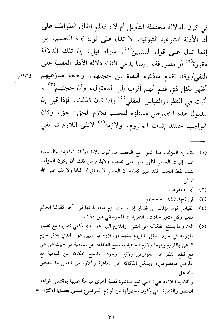 في كون الدلالة محتملة التأويل أم لا فعلم اتفاق الطوائف على أن الأدلة الشرعية الثبوتية لا تدل على قول نفاة الجسم بل إنما تدل على قول المثبتين سواء قيل إن تلك الدلالة مقررة أو مصروفة وإنما يدعي النفاة دلالة الأدلة العقلية على النفي وقد تقدم ما ذكره النفاة من حجتهم وحجة منازعيهم أظهر لكل ذي فهم أنهم اقرب إلى المعقول وأن حجتهم أثبت في النظر والقياس العقلي وإذا كان كذلك فإذا قيل إن مدلول هذه النصوص مستلزمة للجسم فلازم الحق حق وكان الواجب حينئذ إثبات الملزوم ولازمه لا نفي اللازم ثم نفي