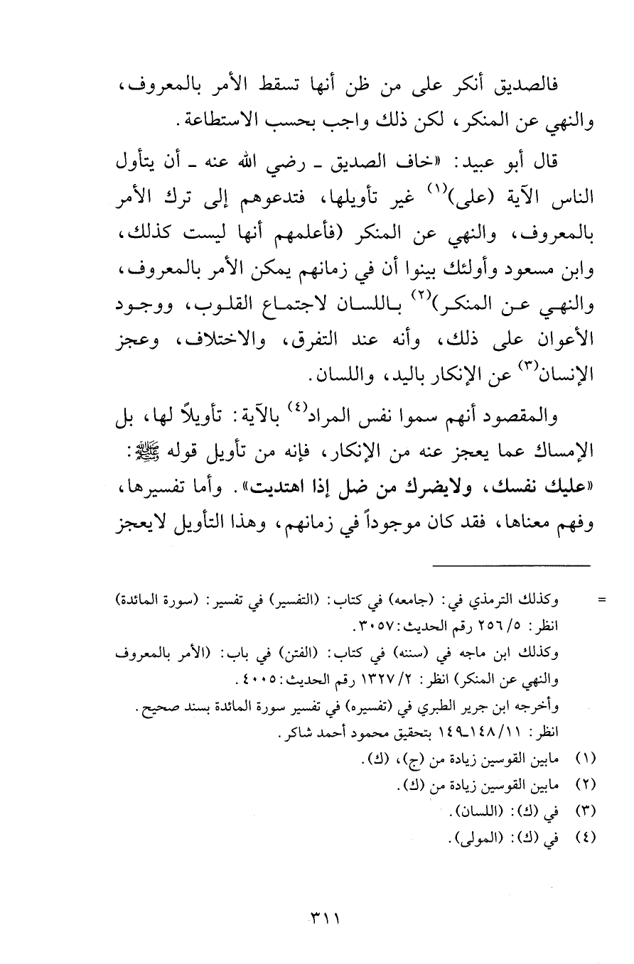 فالصديق أنكر على من ظن أنها تسقط الأمر بالمعروف والنهي عن المنكر لكن ذلك واجب بحسب الاستطاعة قال أبو عبيد خاف الصديق رضي الله عنه أن يتأول الناس الآية على غير تأويلها فتدعوهم إلى ترك الأمر بالمعروف والنهي عن المنكر فأعلمهم أنها ليست كذلك وابن مسعود وأولئك بينوا أن في زمانهم يمكن الأمر بالمعروف والنهي عن المنكر باللسان لاجتماع القلوب ووجود الأعوان على ذلك وأنه عند التفرق والاختلاف وعجز الإنسان عن الإنكار باليد واللسان والمقصود أنهم سموا نفس المراد بالآية تأويلاً لها بل الإمساك عما يعجز عنه من الإنكار فإنه من تأويل قوله صلى الله عليه وسلم عليك نفسك ولا يضرك من ضل إذا اهتديت وأما تفسيرها وفهم معناها فقد كان موجوداً في زمانهم وهذا التأويل لا يعجز