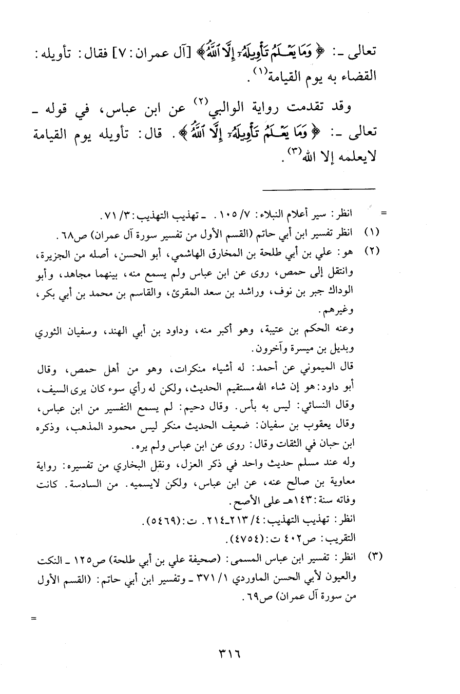 تعالى وَمَا يَعْلَمُ تَأْوِيلَهُ إِلَّا اللَّهُ [آل عمران 7] فقال تأويله القضاء به يوم القيامة وقد تقدمت رواية الوالبي عن ابن عباس في قوله تعالى وَمَا يَعْلَمُ تَأْوِيلَهُ إِلَّا اللَّهُ قال تأويله يوم القيامة لا يعلمه إلا الله