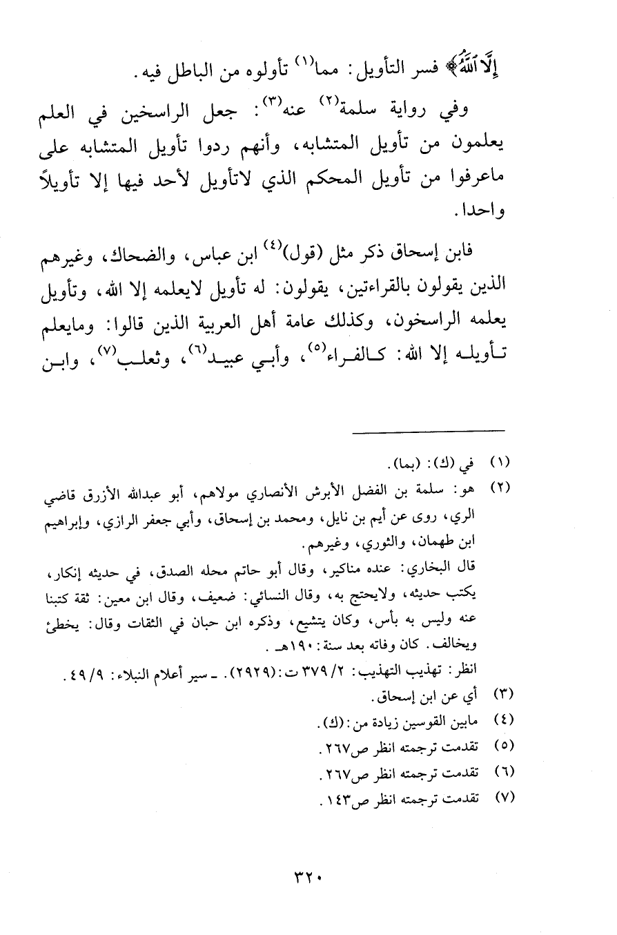 إِلَّا اللَّهُ فسر التأويل مما تأولوه من الباطل فيه وفي رواية سلمة عنه جعل الراسخين في العلم يعلمون من تأويل المتشابه وأنهم ردوا تأويل المتشابه على ما عرفوا من تأويل المحكم الذي لا تأويل لأحد فيه إلا تأويلاً واحدا فابن إسحاق ذكر مثل قول ابن عباس والضحاك وغيرهم الذين يقولون بالقراءتين يقولون له تأويل لا يعلمه إلا الله وتأويل يعلمه الراسخون وكذلك عامة أهل العربية الذين قالوا وما يعلم تأويله إلا الله كالفراء وأبي عبيد وثعلب وابن