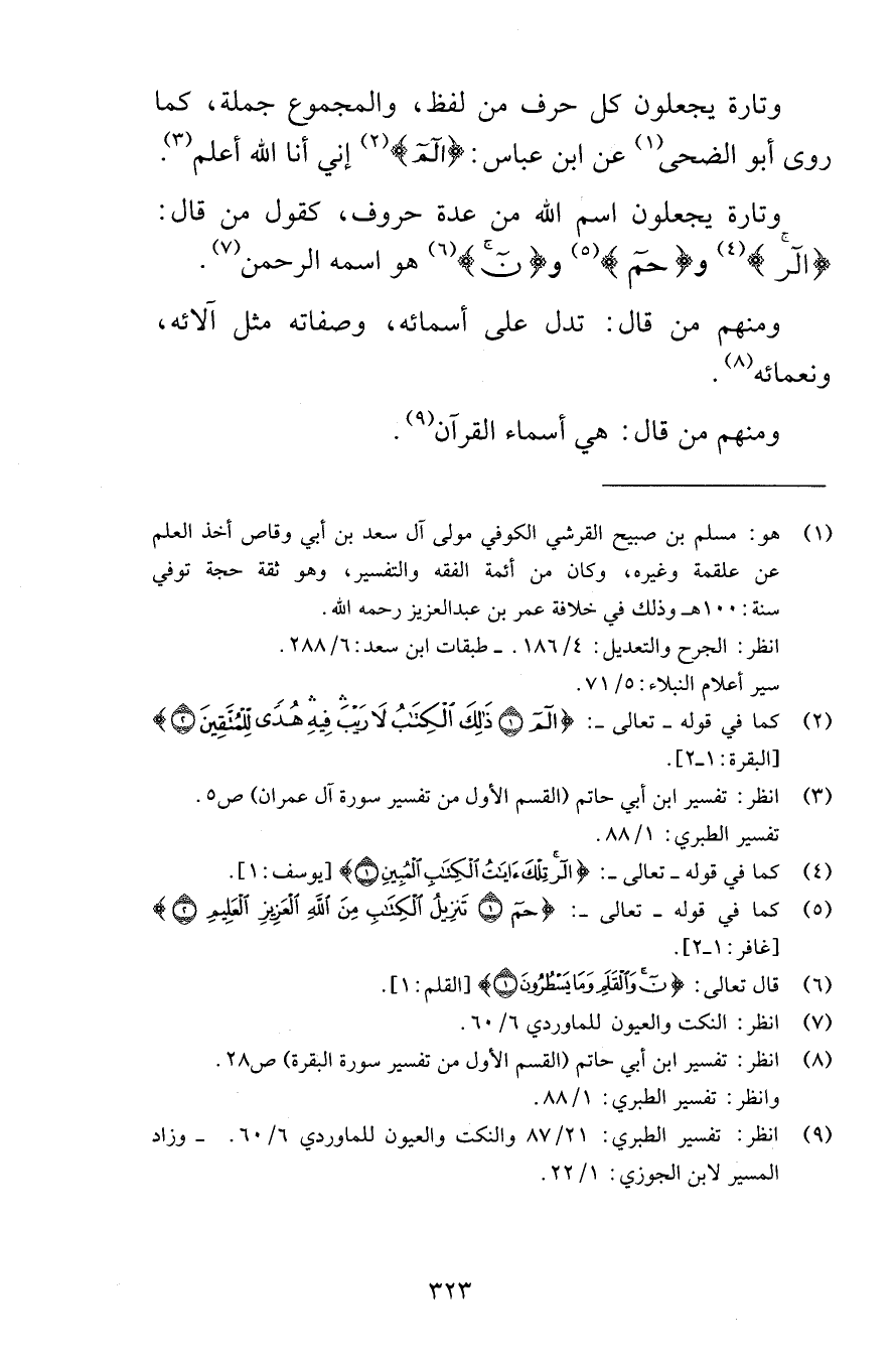وتارة يجعلون كل حرف من لفظ والمجموع جملة كما روى أبو الضحى عن ابن عباس الم إني أنا الله أعلم وتارة يجعلون اسم الله من عدة حروف كقول من قال الر وحم ون هو اسم الرحمن ومنهم من قال تدل على أسمائه وصفاته مثل آلائه ونعمائه ومنهم من قال هي أسماء القرآن