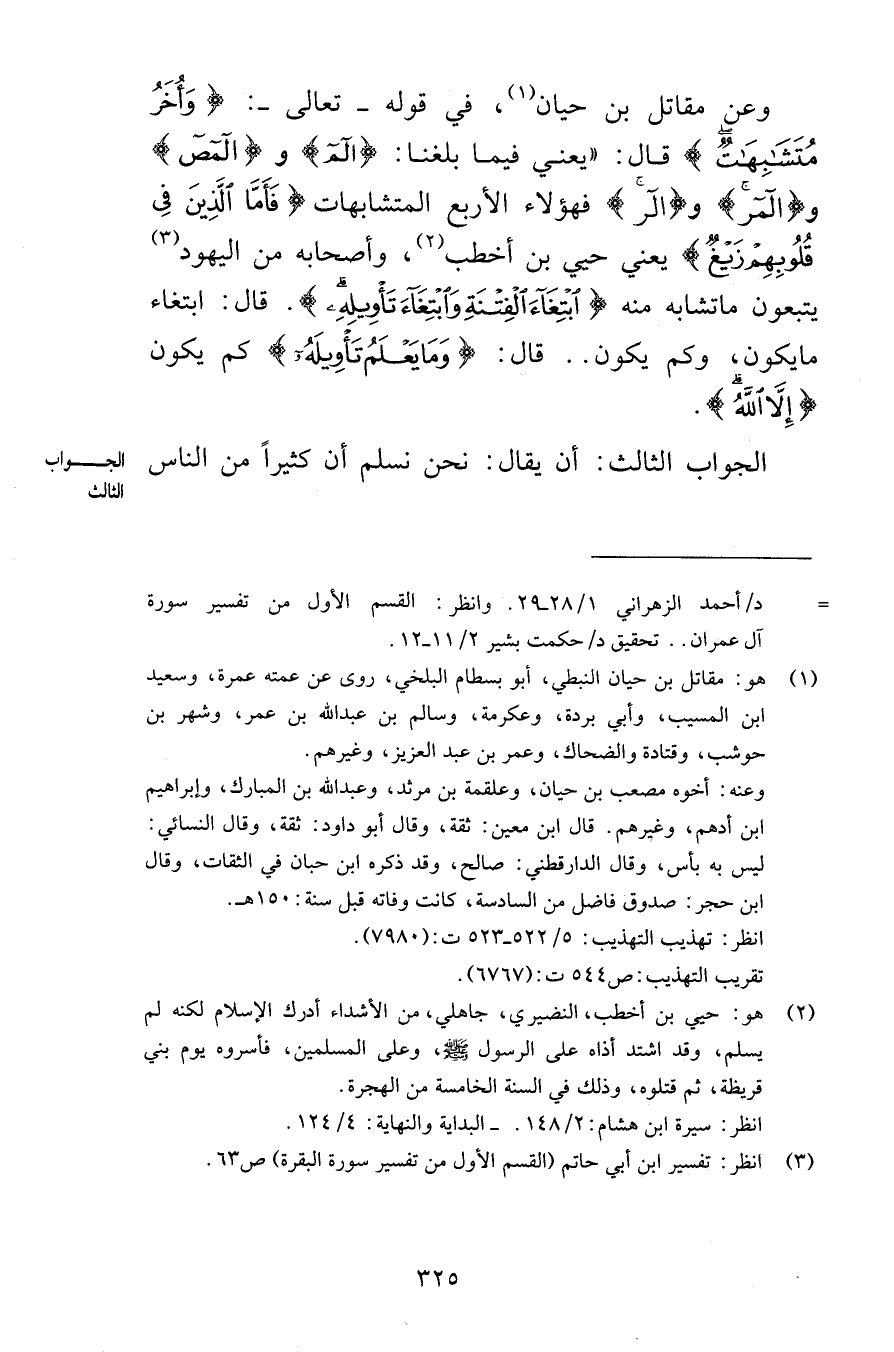 وعن مقاتل بن حيان في قوله تعالى وَأُخَرُ مُتَشَابِهَاتٌ قال يعني فيما بلغنا الم والمص والمر والر فهؤلاء الأربع المتشابهات فَأَمَّا الَّذِينَ فِي قُلُوبِهِمْ زَيْغٌ يعني حيي بن أخطب وأصحابه من اليهود يتبعون ما تشابه منه ابْتِغَاءَ الْفِتْنَةِ وَابْتِغَاءَ تَأْوِيلِهِ قال ابتغاء ما يكون وكم يكون قال وَمَا يَعْلَمُ تَأْوِيلَهُ كم يكون إِلَّا اللَّهُ الجواب الثالث أن يقال نحن نسلم أن كثيراً من الناس