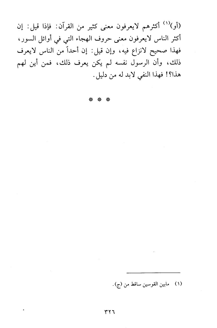 أو أكثرهم لا يعرفون معنى كثير من القرآن فإذا قيل إن أكثر الناس لا يعرفون معنى حروف الهجاء التي في أوائل السور فهذا صحيح لا نزاع فيه وإن قيل إن أحداً من الناس لا يعرف ذلك وأن الرسول نفسه لم يكن يعرف ذلك فمن أين لهم هذا فهذا النفي لابد به من دليل