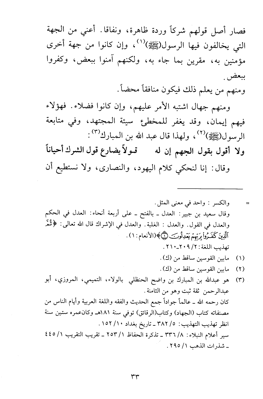 فصار أصل قولهم شركاً وردة ظاهرة ونفاقا أعني من الجهة التي يخالفون فيها الرسول صلى الله عليه وسلم وإن كانوا من جهة أخرى مؤمنين به مقرين بما جاء به ولكنهم آمنوا ببعض وكفروا ببعض ومنهم من يعلم ذلك فيكون منافقاً محضاً ومنهم جهال اشتبه الأمر عليهم وإن كانوا فضلاء فهؤلاء فيهم إيمان وقد يغفر للمخطئ سيئة المجتهد وفي متابعة الرسول صلى الله عليه وسلم ولهذا قال عبد الله بن المبارك ولا أقول بقول الجهم إن له قولاً يضارع قول الشرك أحياناً وقال إنا لنحكي كلام اليهود والنصارى ولا نستطيع أن