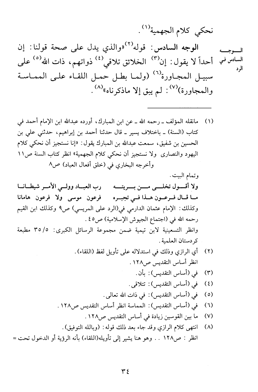 نحكي كلام الجهمية الوجه السادس قوله والذي يدل على صحة قولنا إن أحداً لا يقول إن الخلائق تلاقي ذواتهم ذات الله على سبيل المجاورة ولما بطل حمل اللقاء على المماسة والمجاورة ولم يبق إلا ما ذكرناه