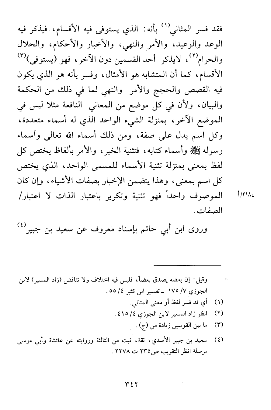 فقد فسر المثاني بأنه الذي يستوفى فيه الأقسام فيذكر فيه الوعد والوعيد والأمر والنهي والأخبار والأحكام والحلال والحرام لا يذكر أحد القسمين دون الآخر فهو يستوفى الأقسام كما أن المتشابه هو الأمثال وفسر بأنه هو الذي يكون فيه القصص والحجج والأمر والنهي لما في ذلك من الحكمة والبيان ولأن في كل موضع من المعاني النافعة مثلا ليس في الموضع الآخر بمنزلة الشيء الواحد الذي له أسماء متعددة وكل اسم يدل على صفة ومن ذلك أسماء الله تعالى وأسماء رسوله صلى الله عليه وسلم وأسماء كتابه فتثنية الخبر والأمر بألفاظ يختص كل لفظ بمعنى بمنزلة تثنية الأسماء للمسمى الواحد الذي يختص كل اسم بمعنى وهذا يتضمن الإخبار بصفات الأشياء وإن كان الموصوف واحداً فهو تثنية وتكرير باعتبار الذات لا اعتبار الصفات وروى ابن أبي حاتم بإسناد معروف عن سعيد بن جبير