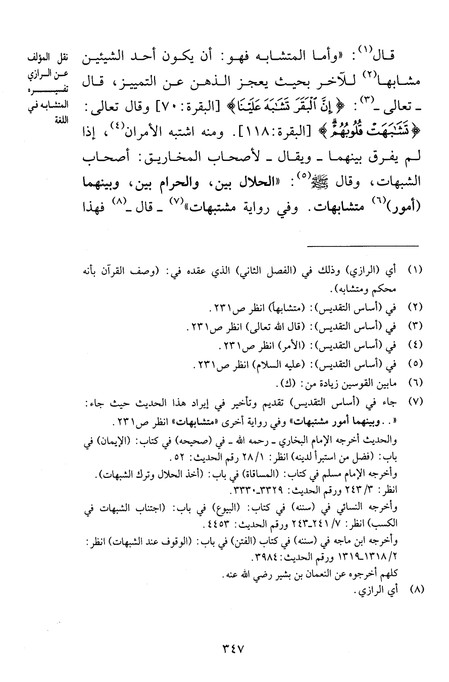 قال وأما المتشابه فهو أن يكون أحد الشيئين مشابها للآخر بحيث يعجز الذهن عن التمييز قال تعالى إِنَّ الْبَقَرَ تَشَابَهَ عَلَيْنَا [البقرة 70] وقال تعالى تَشَابَهَتْ قُلُوبُهُمْ [البقرة 118] ومنه اشتبه الأمران إذا لم يفرق بينهما ويقال لأصحاب المخاريق أصحاب الشبهات وقال صلى الله عليه وسلم الحلال بين والحرام بين وبينهما أمور متشابهات وفي رواية مشتبهات قال فهذا
