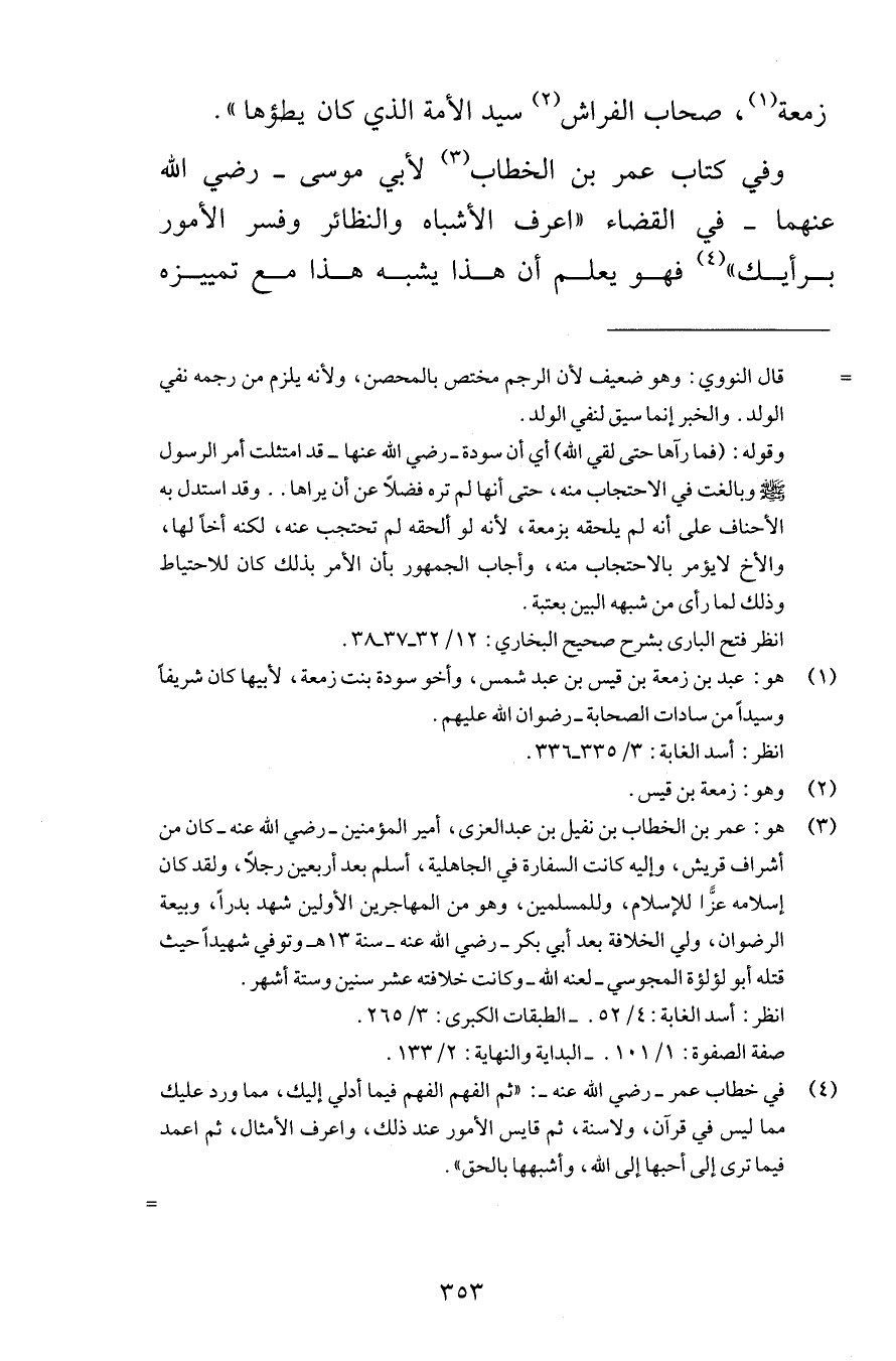 زمعة صحاب الفراش سيد الأمة الذي كان يطؤها وفي كتاب عمر بن الخطاب لأبي موسى رضي الله عنهما في القضاء اعرف الأشباه والنظائر وفسر الأمور برأيك فهو يعلم أن هذا يشبه هذا مع تمييزه