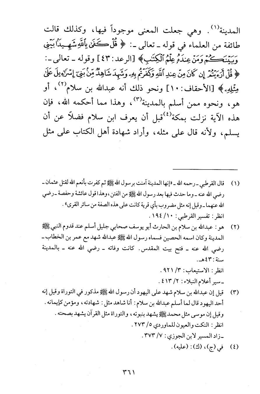 المدينة وهي جعلت المعنى موجوداً فيها وكذلك قالت طائفة من العلماء في قوله تعالى كَفَى بِاللَّهِ شَهِيدًا بَيْنِي وَبَيْنَكُمْ وَمَنْ عِنْدَهُ عِلْمُ الْكِتَابِ [الرعد 43] وقوله تعالى قُلْ أَرَأَيْتُمْ إِنْ كَانَ مِنْ عِنْدِ اللَّهِ وَكَفَرْتُمْ بِهِ وَشَهِدَ شَاهِدٌ مِنْ بَنِي إِسْرَائِيلَ عَلَى مِثْلِهِ [الأحقاف 10] ونحو ذلك أنه عبد الله بن سلام أو هو ونحوه ممن أسلم بالمدينة وهذا مما أحكمه الله فإن هذه الآية نزلت بمكة قبل أن يعرف ابن سلام فضلاً عن أن يسلم ولأنه قال على مثله وأراد شهادة أهل الكتاب على مثل