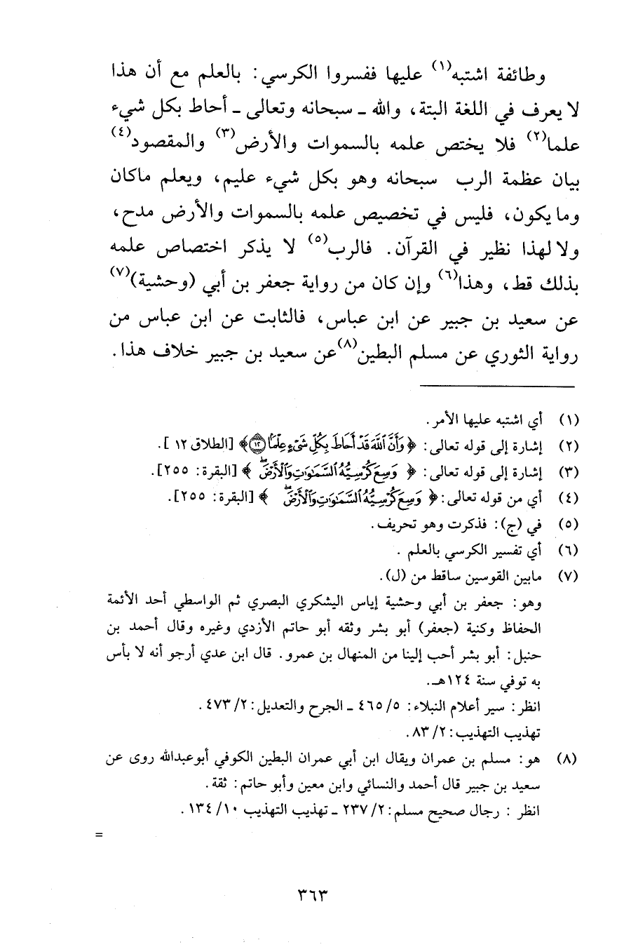 وطائفة اشتبه عليها ففسروا الكرسي بالعلم مع أن هذا لا يعرف في اللغة البتة والله سبحانه وتعالى أحاط بكل شيء علما فلا يختص علمه بالسموات والأرض والمقصود بيان عظمة الرب سبحانه وهو بكل شيء عليم ويعلم ما كان وما يكون فليس في تخصيص علمه بالسموات والأرض مدح ولا لهذا نظير في القرآن فالرب لا يذكر اختصاص علمه بذلك قط وهذا وإن كان من رواية جعفر بن أبي وحشية عن سعيد بن جبير عن ابن عباس فالثابت عن ابن عباس من رواية الثوري عن مسلم البطين عن سعيد بن جبير خلاف هذا