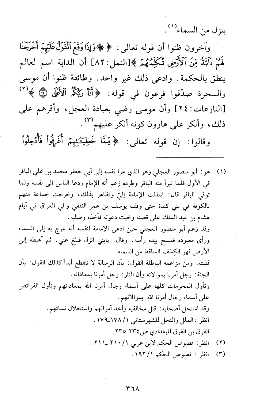 ينزل من السماء وآخرون ظنوا أن قوله تعالى وَإِذَا وَقَعَ الْقَوْلُ عَلَيْهِمْ أَخْرَجْنَا لَهُمْ دَابَّةً مِنَ الْأَرْضِ تُكَلِّمُهُمْ [النمل 82] أن الدابة اسم لعالم ينطق بالحكمة وادعى ذلك غير واحد وطائفة ظنوا أن موسى والسحرة صدّقوا فرعون في قوله أَنَا رَبُّكُمُ الْأَعْلَى (24) [النازعات 24] وأن موسى رضي بعبادة العجل وأقرهم على ذلك وأنكر على هارون كونه أنكر عليهم وقالوا إن قوله تعالى مِمَّا خَطِيئَاتِهِمْ أُغْرِقُوا فَأُدْخِلُوا