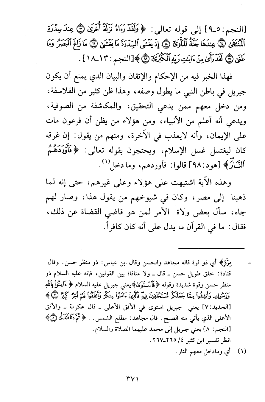 [النجم 5-9] إلى قوله تعالى وَلَقَدْ رَآهُ نَزْلَةً أُخْرَى (13) عِنْدَ سِدْرَةِ الْمُنْتَهَى (14) عِنْدَهَا جَنَّةُ الْمَأْوَى (15) إِذْ يَغْشَى السِّدْرَةَ مَا يَغْشَى (16) مَا زَاغَ الْبَصَرُ وَمَا طَغَى (17) لَقَدْ رَأَى مِنْ آيَاتِ رَبِّهِ الْكُبْرَى (18) [النجم 13-18] فهذا الخبر فيه من الإحكام والإتقان والبيان الذي يمنع أن يكون جبريل في باطن النبي ما يطول وصفه وهذا ظن كثير من الفلاسفة ومن دخل معهم ممن يدعي التحقيق والمكاشفة من الصوفية ويدعي أنه أعلم من الأنبياء ومن هؤلاء من يظن أن فرعون مات على الإيمان وأنه لا يعذب في الآخرة ومنهم من يقول إن غرقه كان ليغتسل غسل الإسلام ويحتجون بقوله تعالى فَأَوْرَدَهُمُ النَّارَ [هود 98] قالوا فأوردهم وما دخل وهذه الآية اشتبهت على هؤلاء وعلى غيرهم حتى إنه لما ذهبنا إلى مصر وكان في شيوخهم من يقول هذا وصار لهم جاه سأل بعض ولاة الأمر لمن هو قاضي القضاة عن ذلك فقال ما في القرآن ما يدل على أنه كافراً