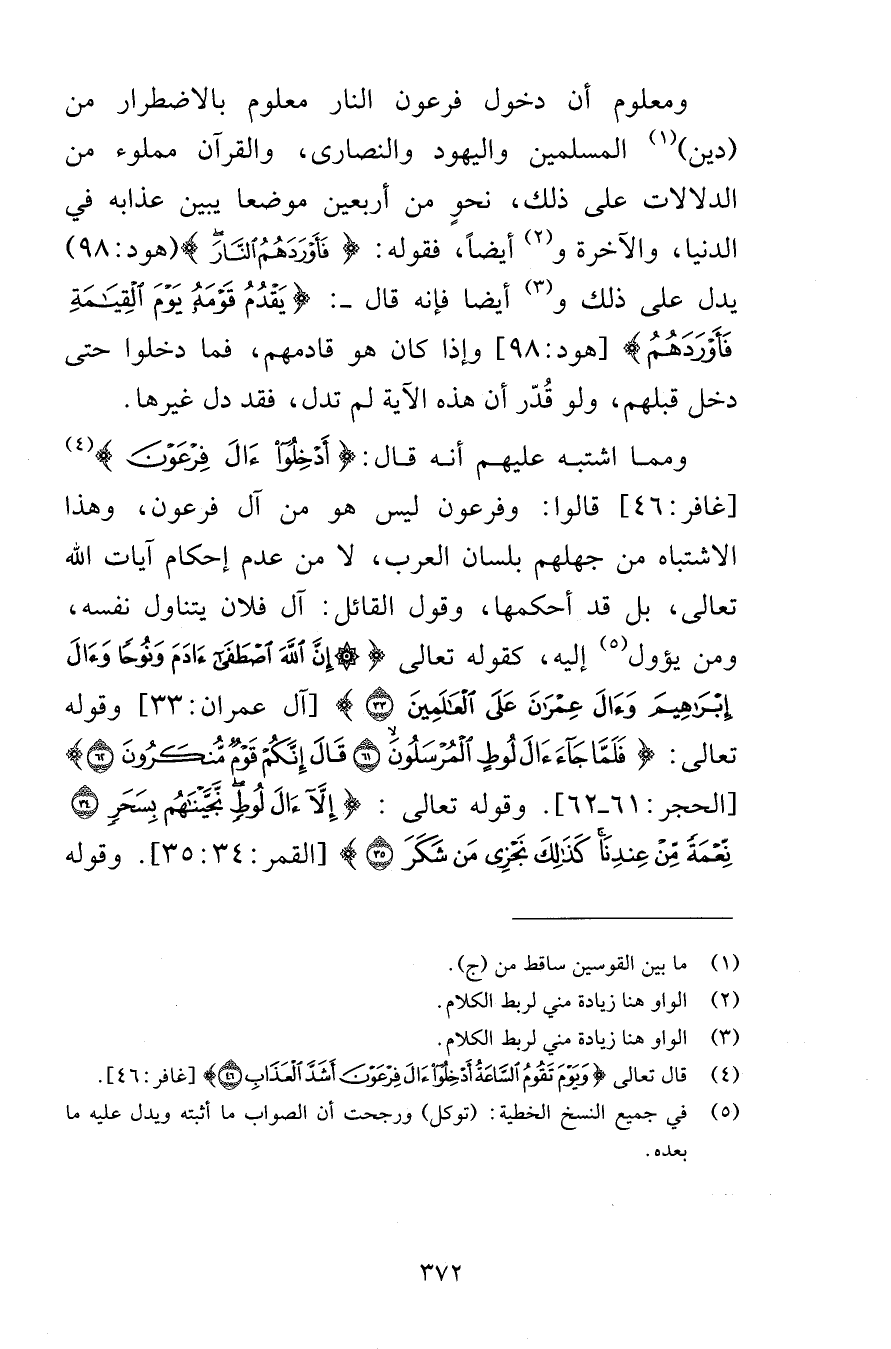 ومعلوم أن دخول فرعون النار معلوم بالاضطرار من دين المسلمين واليهود والنصارى والقرآن مملوء من الدلالات على ذلك نحوٍ من أربعين موضعا يبين عذابه في الدنيا والآخرة وأيضاً قوله فَأَوْرَدَهُمُ النَّارَ [هود 98] يدل على ذلك وأيضا فإنه قال يَقْدُمُ قَوْمَهُ يَوْمَ الْقِيَامَةِ فَأَوْرَدَهُمُ [هود 98] وإذا كان هو قادمهم فما دخلوا حتى دخل قبلهم ولو قُدّر أن هذه الآية لم تدل فقد دل غيرها ومما اشتبه عليهم أنه قال أَدْخِلُوا آلَ فِرْعَوْنَ [غافر 46] قالوا وفرعون ليس هو من آل فرعون وهذا الاشتباه من جهلهم بلسان العرب لا من عدم إحكام آيات الله تعالى بل قد أحكمها وقول القائل آل فلان يتناول نفسه ومن يؤول إليه كقوله تعالى إِنَّ اللَّهَ اصْطَفَى آدَمَ وَنُوحًا وَآلَ إِبْرَاهِيمَ وَآلَ عِمْرَانَ عَلَى الْعَالَمِينَ (33) [آل عمران 33] وقوله تعالى فَلَمَّا جَاءَ آلَ لُوطٍ الْمُرْسَلُونَ (61) قَالَ إِنَّكُمْ قَوْمٌ مُنْكَرُونَ (62) [الحجر 61-62] وقوله تعالى إِلَّا آلَ لُوطٍ نَجَّيْنَاهُمْ بِسَحَرٍ (34) نِعْمَةً مِنْ عِنْدِنَا كَذَلِكَ نَجْزِي مَنْ شَكَرَ (35) [القمر 34-35] وقوله