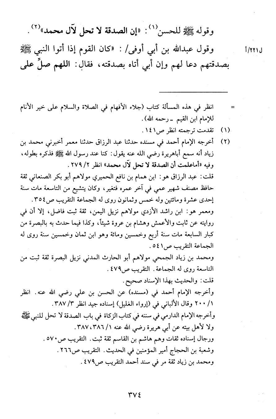 وقوله صلى الله عليه وسلم للحسن إن الصدقة لا تحل لآل محمد وقول عبد الله بن أبي أوفى كان القوم إذا أتوا النبي صلى الله عليه وسلم بصدقتهم دعا لهم وإن أبي أتله بصدقته فقال اللهم صلِّ على