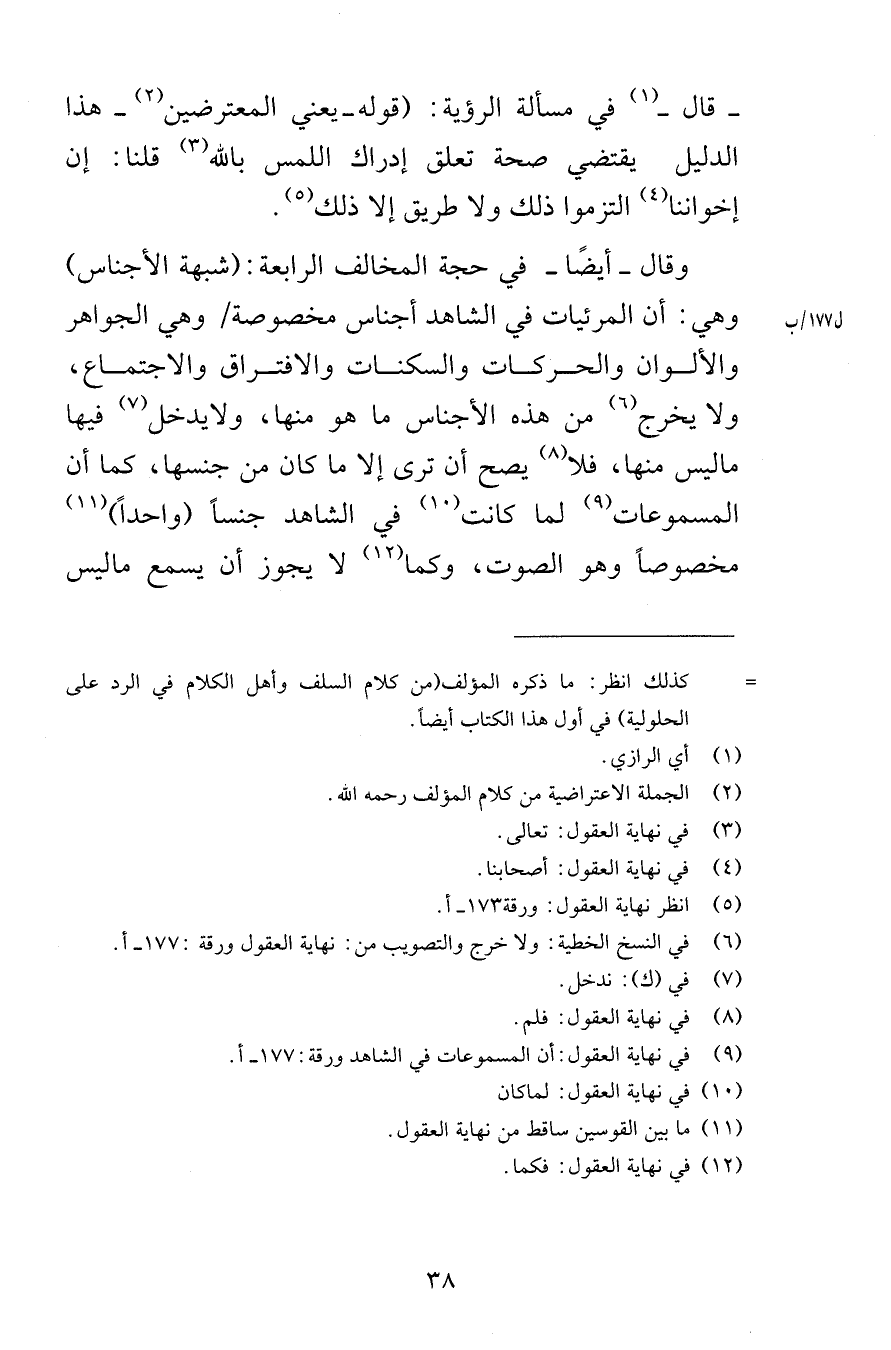 قال في مسألة الرؤية قوله يعني المعترضين هذا الدليل يقتضي صحة تعلق إدراك اللمس بالله قلنا إن إخواننا التزموا ذلك ولا طريق إلا ذلك وقال أيضًا في حجة المخالف الرابعة شبهة الأجناس وهي أن المرئيات في الشاهد أجناس مخصوصة وهي الجواهر والألوان والحركات والسكنات والافتراق والاجتماع ولا يخرج من هذه الأجناس ما هو منها ولا يدخل فيها ما ليس منها فلا يصح أن ترى إلا ما كان من جنسها كما أن المسموعات لما كانت في الشاهد جنساً واحداً مخصوصاً وهو الصوت وكما لا يجوز أن يسمع ما ليس