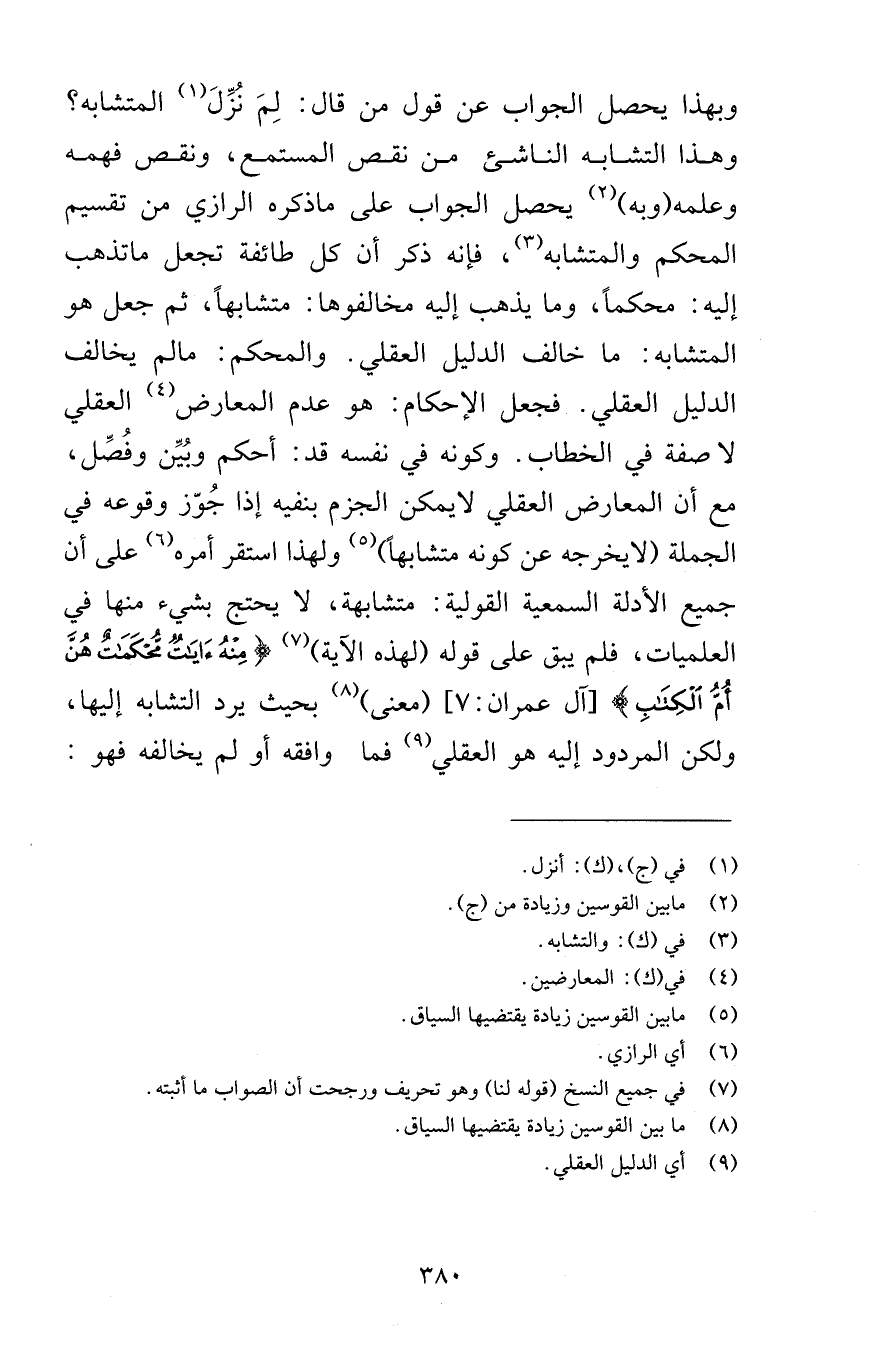 وبهذا يحصل الجواب عن قول من قال لِمَ نُزِّلَ المتشابه وهذا التشابه الناشئ من نقص المستمع ونقص فهمه وعلمه وبه يحصل الجواب على ما ذكره الرازي من تقسيم المحكم والمتشابه فإنه ذكر أن كل طائفة تجعل ما تذهب إليه محكماً وما يذهب إليه مخالفوها متشابهاً ثم جعل هو المتشابه ما خالف الدليل العقلي والمحكم ما لم يخالف الدليل العقلي فجعل الإحكام هو عدم المعارض العقلي لا صفة في الخطاب وكونه في نفسه قد أحكم وبُيِّن وفُصِّل مع أن المعارض العقلي لا يمكن الجزم بنفيه إذا جُوّز وقوعه في الجملة لا يخرجه عن كونه متشابهاً ولهذا استقر أمره على أن جميع الأدلة السمعية القولية متشابهة لا يحتج بشيء منها في العلميات فلم يبق على قوله لهذه الآية مِنْهُ آيَاتٌ مُحْكَمَاتٌ هُنَّ أُمُّ الْكِتَابِ [آل عمران 7] معنى بحيث يرد التشابه إليها ولكن المردود إليه هو العقلي فما وافقه أو لم يخالفه فهو