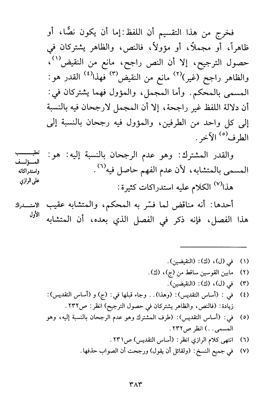 فخرج من هذا التقسيم أن اللفظ إما أن يكون نصًّا أو ظاهراً أو مجملاً أو مؤولاً فالنص والظاهر يشتركان في حصول الترجيح إلا أن النص راجح مانع من النقيض والظاهر راجح غير مانع من النقيض فهذا القدر هو المسمى بالمحكم وأما المجمل والمؤول فهما يشتركان في أن دلالة اللفظ غير راجحة إلا أن المجمل لا رجحان فيه بالنسبة إلى الطرف الآخر والقدر المشترك وهو عدم الرجحان بالنسبة إليه هو المسمى بالمتشابه لأن عدم الفهم حاصل فيه هذا الكلام عليه استدراكات كثيرة أحدها أنه مناقض لما فسّر به المحكم والمتشابه عقيب هذا الفصل فإنه ذكر في الفصل الذي بعده أن المتشابه