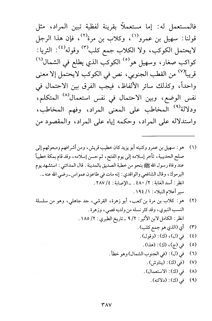 فالمستعمل له إما مستعملاً بقرينة لفظية تبين المراد مثل قولنا سهيل بن عمرو وكلاب بن مرة فإن هذا الرجل لا يحتمل الكوكب ولا الكلاب جمع كلب وقوله الثريا كواكب صغار وسهيل هو الكوكب الذي يطلع في الشمال قريباً من القطب الجنوبي نص في الكوكب لا يحتمل إلا معنى واحداً وكذلك سائر الألفاظ فيجب الفرق بين الاحتمال في نفس الوضع وبين الاحتمال في نفس استعمال المتكلم ودلالة المخاطب على المعنى المراد وفهم المخاطب واستدلاله على المراد وحكمه إياه على المراد والمقصود من