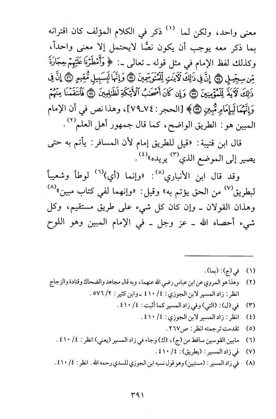 معنى واحد ولكن لما ذكر في الكلام المؤلف كان اقترانه بما ذكر معه يوجب أن يكون نصًّا لا يحتمل إلا معنى واحداً وكذلك لفظ الإمام في مثل قوله تعالى وَأَمْطَرْنَا عَلَيْهِمْ حِجَارَةً مِنْ سِجِّيلٍ (74) إِنَّ فِي ذَلِكَ لَآيَاتٍ لِلْمُتَوَسِّمِينَ (75) وَإِنَّهَا لَبِسَبِيلٍ مُقِيمٍ (76) إِنَّ فِي ذَلِكَ لَآيَةً لِلْمُؤْمِنِينَ (77) وَإِنْ كَانَ أَصْحَابُ الْأَيْكَةِ لَظَالِمِينَ (78) فَانْتَقَمْنَا مِنْهُمْ وَإِنَّهُمَا لَبِإِمَامٍ مُبِينٍ (79) [الحجر 74-79] وهذا نص في أن الإمام المبين هو الطريق الواضح كما قال جمهور أهل العلم قال ابن قتيبة قيل للطريق إمام لأن المسافر يأتم به حتى يصير إلى الموضع الذي يريده وقد قال ابن الأنباري وإنما أي لوطاً وشعيباً لبطريق من الحق يؤتم به وقيل وإنهما لفي كتاب مبين وهذان القولان وإن كان كل شيء على طريق مستقيم وكل شيء أحصاه الله عز وجل في الإمام المبين وهو اللوح
