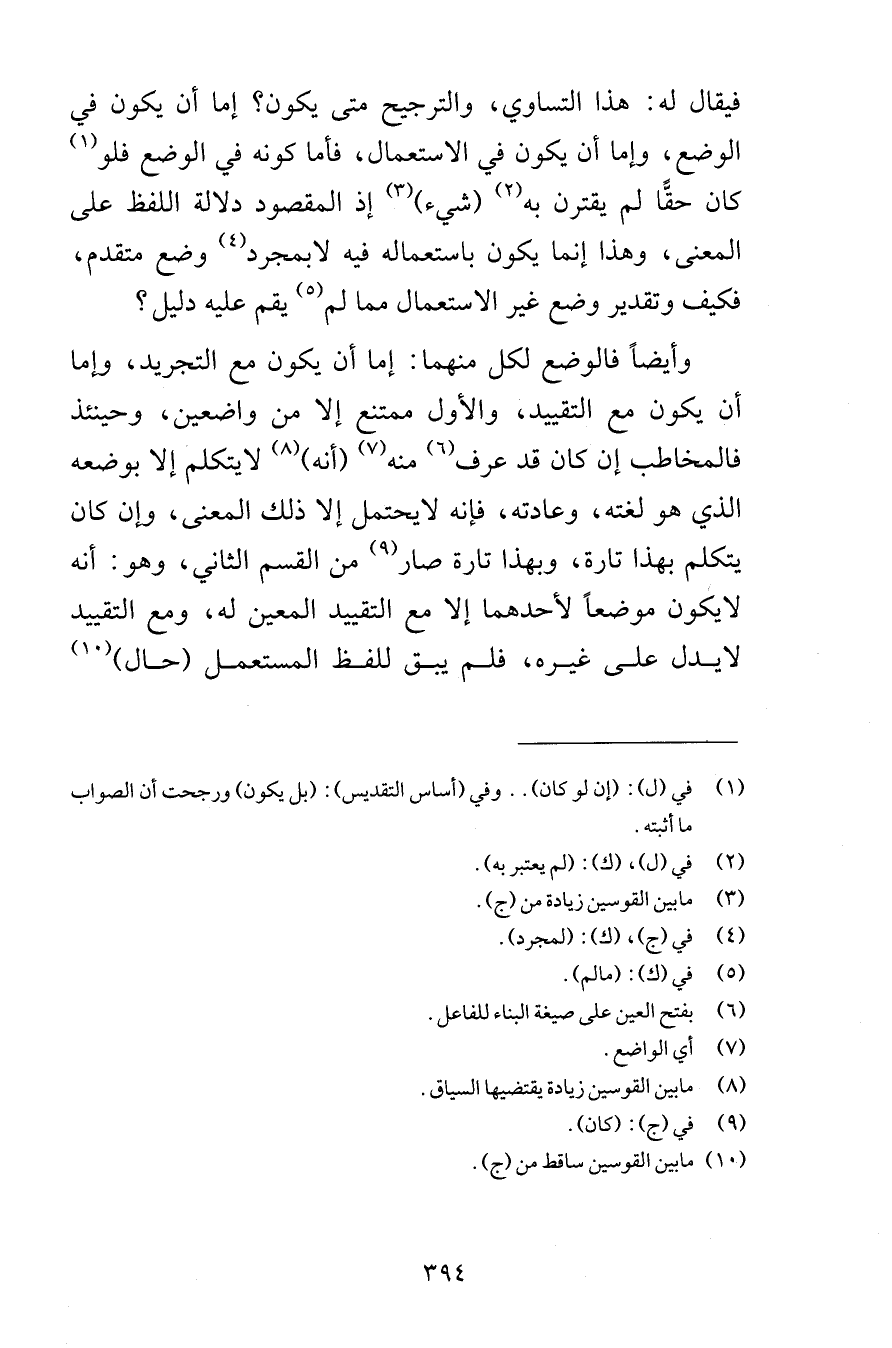 فيقال له هذا التساوي والترجيح متى يكون إما أن يكون في الوضع وإما أن يكون في الاستعمال فأما كونه في الوضع فلو كان حقًّا لم يقترن به شيء إذ المقصود دلالة اللفظ على المعنى وهذا إنما يكون باستعماله فيه لا بمجرد وضع متقدم فكيف وتقدير وضع غير الاستعمال مما لم يقم عليه دليل وأيضاً فالوضع لكل منهما إما أن يكون مع التجريد وإما أن يكون مع التقييد والأول ممتنع إلا من واضعين وحينئذ فالمخاطب إن كان قد عرف منه أنه لا يتكلم إلا بوضعه الذي هو لغته وعادته فإنه لا يحتمل إلا ذلك المعنى وإن كان يتكلم بهذا تارة وبهذا تارة صار من القسم الثاني وهو أنه لا يكون موضعاً لأحدهم إلا مع التقييد المعين له ومع التقييد لا يدل على غيره فلم يبق للفظ المستعمل حال