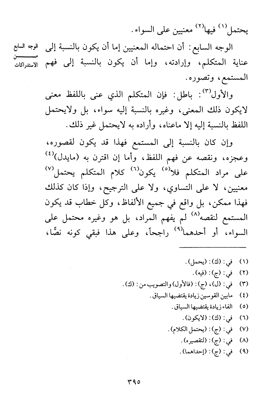 يحتمل فيها معنيين على السواء الوجه السابع أن احتمال المعنيين إما أن يكون بالنسبة إلى عناية المتكلم وإرادته وإما أن يكون بالنسبة إلى فهم المستمع وتصوره والأول باطل فإن المتكلم الذي عنى باللفظ معنى لا يكون ذلك المعنى وغيره بالنسبة إليه سواء بل ولا يحتمل اللفظ بالنسبة إليه إلا ما عناه وأراده به لا يحتمل غير ذلك وإن كان بالنسبة إلى المستمع فهذا قد يكون لقصوره وعجزه ونقصه عن فهم اللفظ وأما إن اقترن به ما يدل على مراد المتكلم فلا يكون كلام المتكلم يحتمل معنيين لا على التساوي ولا على الترجيح وإذا كان كذلك فهذا ممكن بل واقع في جميع الألفاظ وكل خطاب قد يكون المستمع لنقصه لم يفهم المراد بل هو وغيره محتمل على السواء أو أحدهما راجحاً وعلى هذا فبقي كونه نصًّا