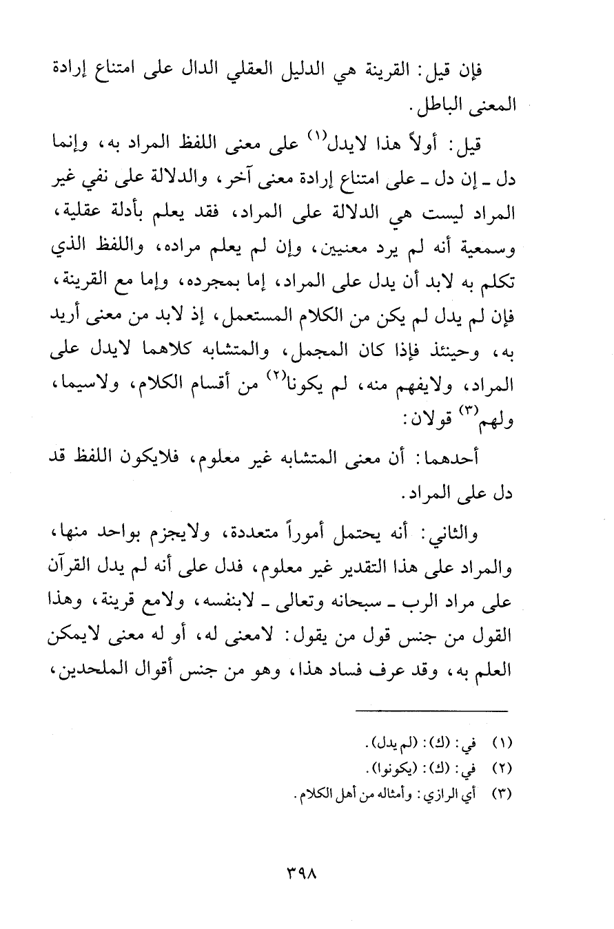 فإن قيل القرينة هي الدليل العقلي الدال على امتناع إرادة المعنى الباطل قيل أولاً هذا لا يدل على معنى اللفظ المراد به وإنما دل إن دل على امتناع إرادة معنى آخر والدلالة على نفي غير المراد ليست هي الدلالة على المراد فقد يعلم بأدلة عقلية وسمعية انه لم يرد معنيين وإن لم يعلم مراده واللفظ الذي تكلم به لابد أن يدل على المراد إما بمجرده وإما مع القرينة فإن لم يدل لم يكن من الكلام المستعمل إذ لابد من مغنى أريد به وحينئذ فإذا كان المجمل والمتشابه كلاهما لا يدل على المراد ولا يفهم منه لم يكونا من أقسام الكلام ولاسيما ولهم قولان أحدهما أن معنى المتشابه غير معلوم فلا يكون اللفظ قد دل على المراد والثاني أنه يحتمل أموراً متعددة ولا يجزم بواحد منها والمراد على هذا التقدير غير معلوم فدل على أنه لم يدل القرآن على مراد الرب سبحانه وتعالى لا بنفسه ولا مع قرينة وهذا القول من جنس قول من يقول لا معنى له أو له معنى لا يمكن العلم به وقد عرف فساد هذا وهو من جنس أقوال الملحدين