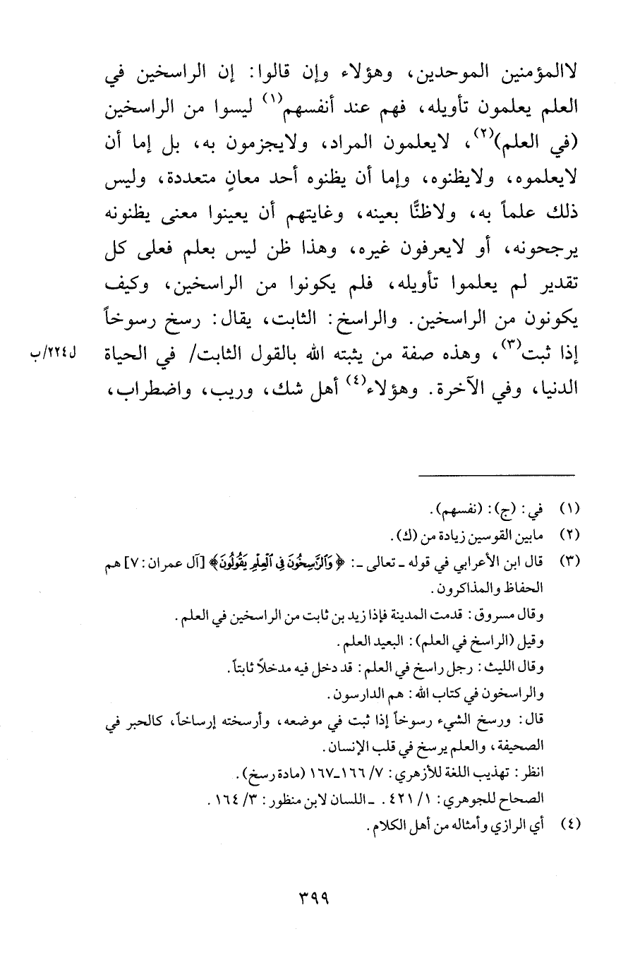 لا المؤمنين الموحدين وهؤلاء وإن قالوا إن الراسخين في العلم يعلمون تأويله فهم عند أنفسهم ليسوا من الراسخين في العلم لا يعلمون المراد ولا يجزمون به بل إما أن لا يعلموه ولا يظنوه وإما أن يظنوه أحد معانٍ متعددة وليس ذلك علماً به ولا ظنًّا بعينه وغايتهم أن يعينوا معنى يظنونه ويرجحونه أو لا يعرفون غيره وهذا ظن ليس بعلم فعلى كل تقدير لم يعلموا تأويله فلم يكونوا من الراسخين وكيف يكونون من الراسخين والراسخ الثابت يقال رسخ رسوخاً إذا ثبت وهذه صفة من يثبته الله بالقول الثابت في الحياة الدنيا وفي الآخرة وهؤلاء أهل شك وريب واضطراب