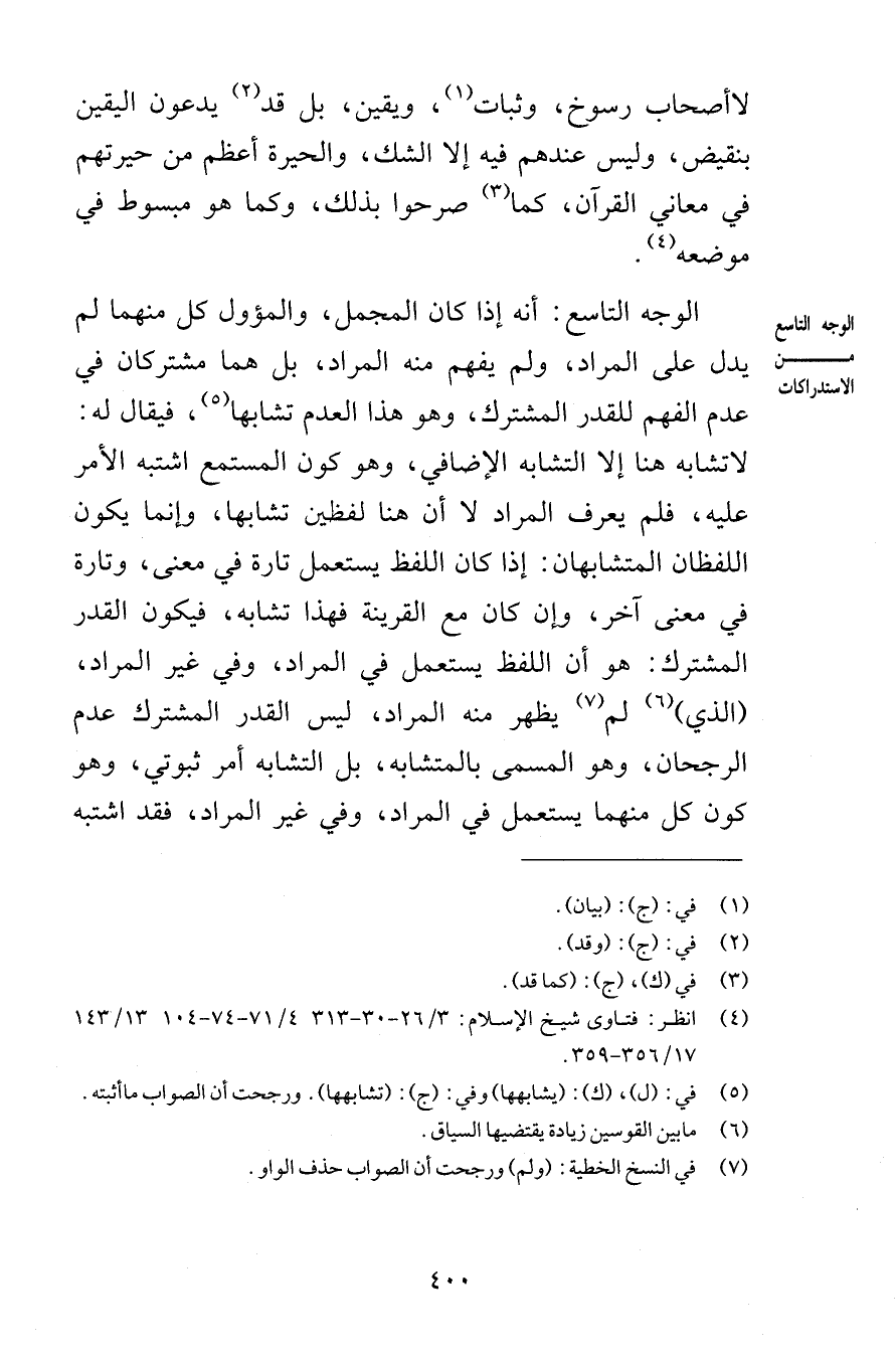 لا أصحاب رسوخ وثبات ويقين بل قد يدعون اليقين بنقيض وليس عندهم فيه إلا الشك والحيرة أعظم من حيرتهم في معاني القرآن كما صرحوا بذلك وكما هو مبسوط في موضعه الوجه التاسع أنه إذا كان المجمل والمؤول كل منهما لم يدل على المراد ولم يفهم منه المراد بل هما مشتركان في عدم الفهم للقدر المشترك وهو هذا العدم تشابها فيقال له لا تشابه هنا إلا التشابه الإضافي وهو كون المستمع اشتبه الأمر عليه فلم يعرف المراد لا أن هنا لفظين تشابها وإنما يكون اللفظان المتشابهان إذا كان اللفظ يستعمل تارة في معنى وتارة في معنى آخر وإن كان مع القرينة فهذا تشابه فيكون القدر المشترك هو أن اللفظ يستعمل في المراد وفي غير المراد الذي لم يظهر منه المراد ليس القدر المشترك عدم الرجحان وهو المسمى بالمتشابه بل التشابه أمر ثبوتي وهو كون كل منهما يستعمل في المراد وفي غير المراد فقد اشتبه