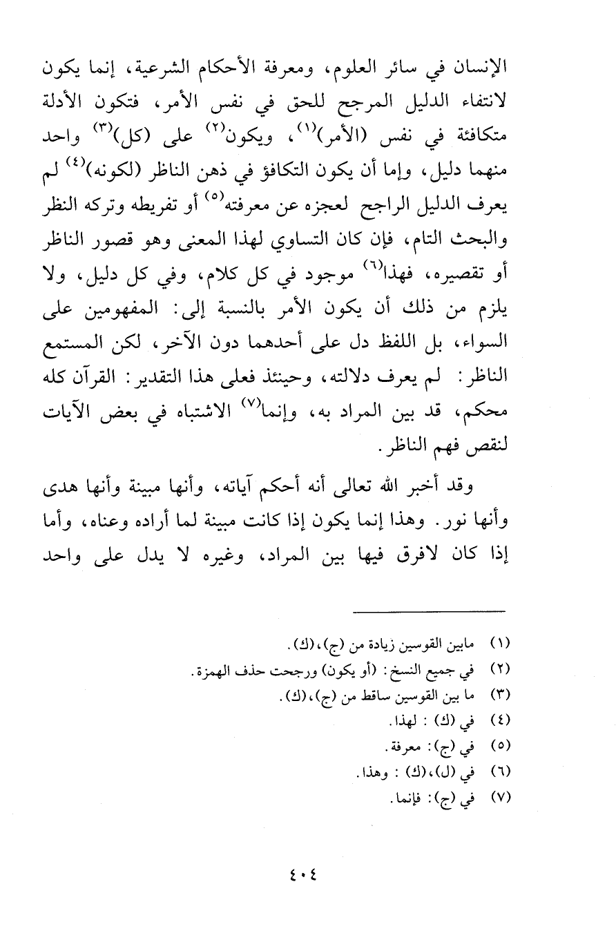 الإنسان في سائر العلوم ومعرفة الأحكام الشرعية إنما يكون لانتفاء الدليل المرجح للحق في نفس الأمر فتكون الأدلة متكافئة في نفس الأمر ويكون على كل واحد منهما دليل وإما أن يكون التكافؤ في ذهن الناظر لكونه لم يعرف الدليل الراجح لعجزه عن معرفته أو تفريطه وتركه النظر والبحث التام فإن كان التساوي لهذا المعنى وهو قصور الناظر أو تقصيره فهذا موجود في كل كلام وفي كل دليل ولا يلزم من ذلك أن يكون الأمر بالنسبة إلى المفهومين على السواء بل اللفظ دل على أحدهما دون الآخر لكن المستمع الناظر لم يعرف دلالته وحينئذ فعلى هذا التقدير القرآن كله محكم قد بين المراد به وإنما الاشتباه في بعض الآيات لنقص فهم الناظر وقد أخبر الله تعالى أنه أحكم آياته وأنها مبينة وأنها هدى وأنها نور وهذا إنما يكون إذا كانت مبينة لما أراده وعناه وأما إذا كان لا فرق فيها بين المراد وغيره لا يدل على واحد
