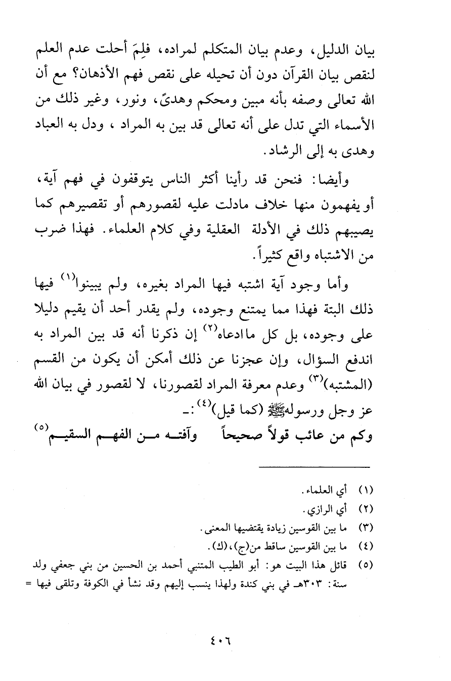 بيان الدليل وعدم بيان المتكلم لمراده فلِمَ أحلت عدم العلم لنقص بيان القرآن دون أن تحيله على نقص فهم الأذهان مع أن الله تعالى وصفه بأنه مبين ومحكم وهدىً ونور وغير ذلك من الأسماء التي تدل على أنه تعالى قد بين به المراد ودل به العباد وهدى به إلى الرشاد وأيضا فنحن قد رأينا أكثر الناس يتوقفون في فهم آية أو يفهمون منها خف ما دلت عليه لقصورهم أو تقصيرهم كما يصيبهم ذلك في الأدلة العقلية وفي كلام العلماء فهذا ضرب من الاشتباه واقع كثيراً وأما وجود آية اشتبه فيها المراد بغيره ولم يبينوا فيها ذلك البتة فهذا مما يمتنع وجوده ولم يقدر أحد أن يقيم دليلا على وجوده بل كل ما ادعاه إن ذكرنا أنه قد بين المراد به اندفع السؤال وإن عجزنا عن ذلك أمكن أن يكون من القسم المشتبه وعدم معرفة المراد لقصورنا لا لقصور في بيان الله عز وجل ورسوله صلى الله عليه وسلم كما قيل وكم من عائب قولاً صحيحاً وآفته من الفهم السقيم