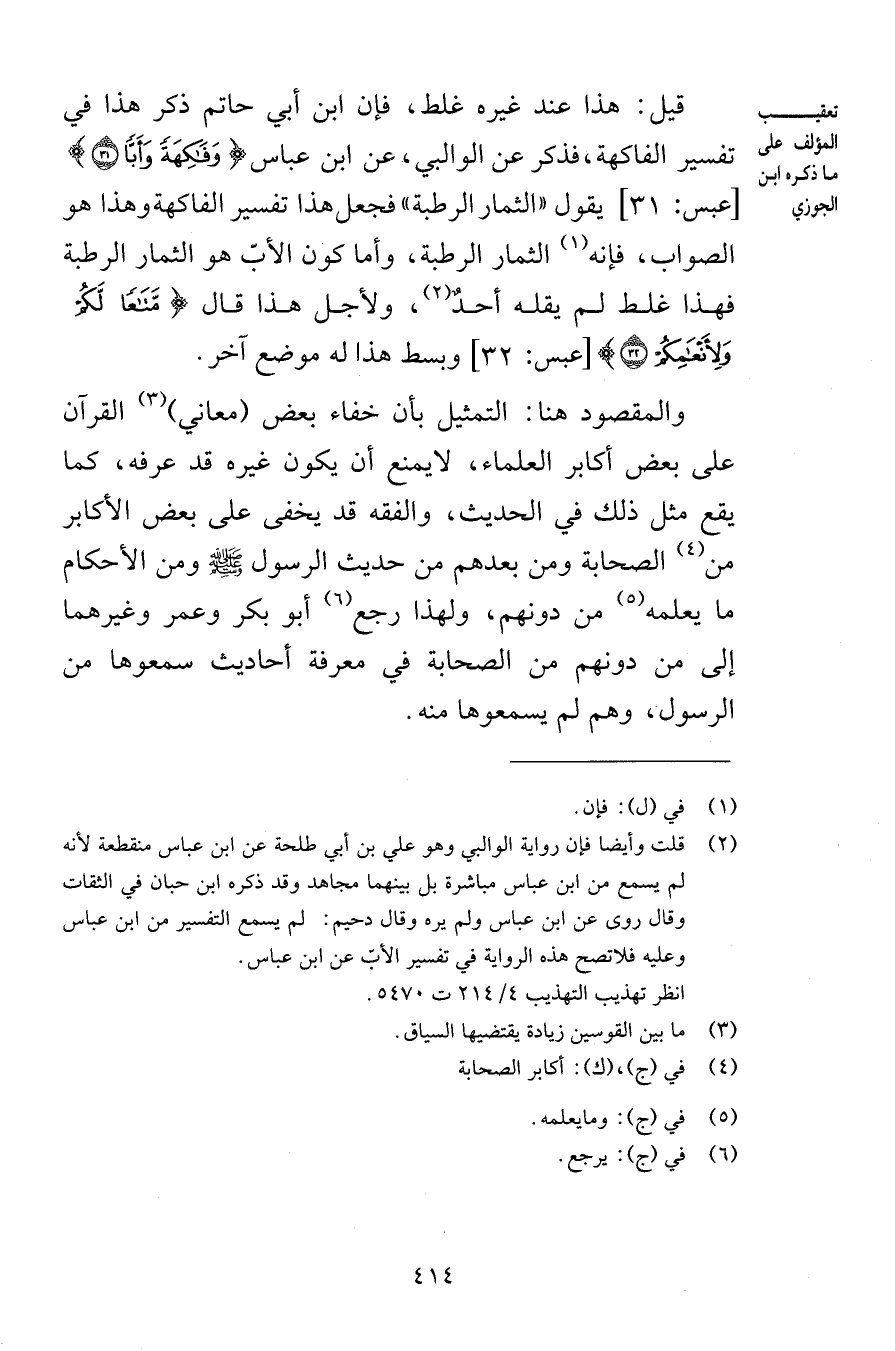 قيل هذا عند غيره غلط فإن ابن أبي حاتم ذكر هذا في تفسير الفاكهة فذكر عن الوالبي عن ابن عباس وَفَاكِهَةً وَأَبًّا (31) [عبس 31] يقول الثمار الرطبة فجعل هذا تفسير الفاكهة وهذا هو الصواب فإنه الثمار الرطبة وأما كون الأبّ هو الثمار الرطبة فهذا غلط لم يقله أحدٌ ولأجل هذا قال مَتَاعًا لَكُمْ وَلِأَنْعَامِكُمْ (32) [عبس 32] وبسط هذا له موضع آخر والمقصود هنا التمثيل بأن خفاء بعض معاني القرآن على بعض أكابر العلماء لا يمنع أن يكون غيره قد عرفه كما يقع مثل ذلك في الحديث والفقه وقد يخفى على بعض الأكابر من الصحابة ومن بعدهم حديث الرسول صلى الله عليه وسلم ومن الأحكام ما يعلمه من دونهم ولهذا رجع أبو بكر وعمر وغيرهما إلى من دونهم من الصحابة في معرفة أحاديث سمعوها من الرسول وهم لم يسمعوها منه