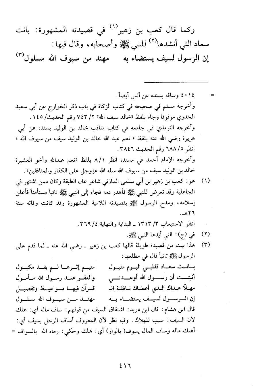 وكما قال كعب بن زهير في قصيدته المشهورة بانت سعاد التي أنشدها للنبي صلى الله عليه وسلم وأصحابه وقال فيها إن الرسول لسيف يستضاء به مهند من سيوف الله مسلول