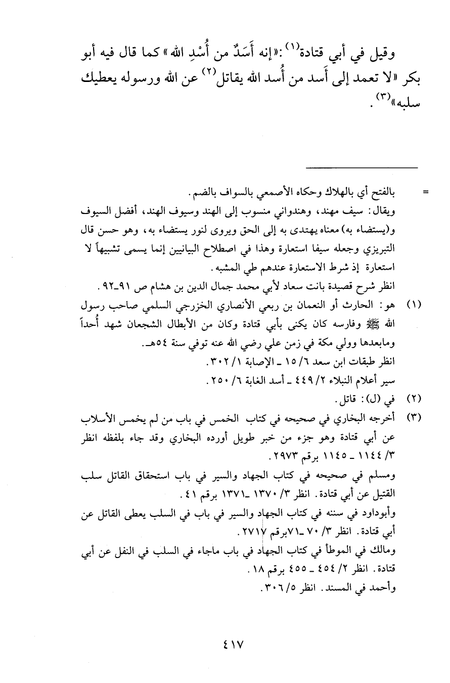 وقيل في أبي قتادة إنه أَسَدٌ من أُسْدِ الله كما قال فيه أبو بكر لا تعمد إلى أَسد من أُسد الله يقاتل عن الله ورسوله يعطيك سلبه