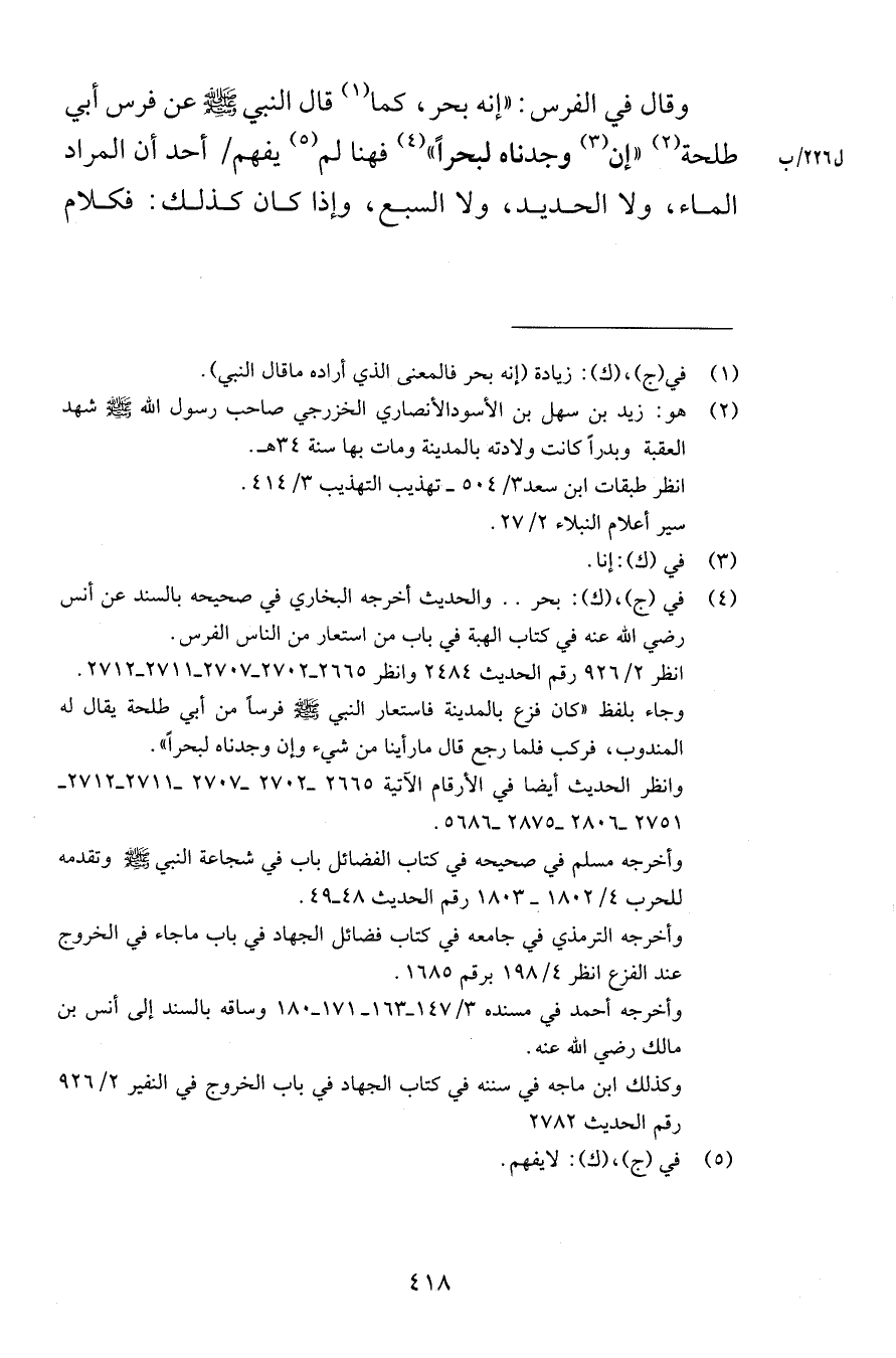 وقال في الفرس إنه بحر كما قال النبي صلى الله عليه وسلم عن فرس أبي طلحة إن وجدناه لبحراً فهنا لم يفهم أحد أن المراد الماء ولا الحديد ولا السبع وإذا كان كذلك فكلام