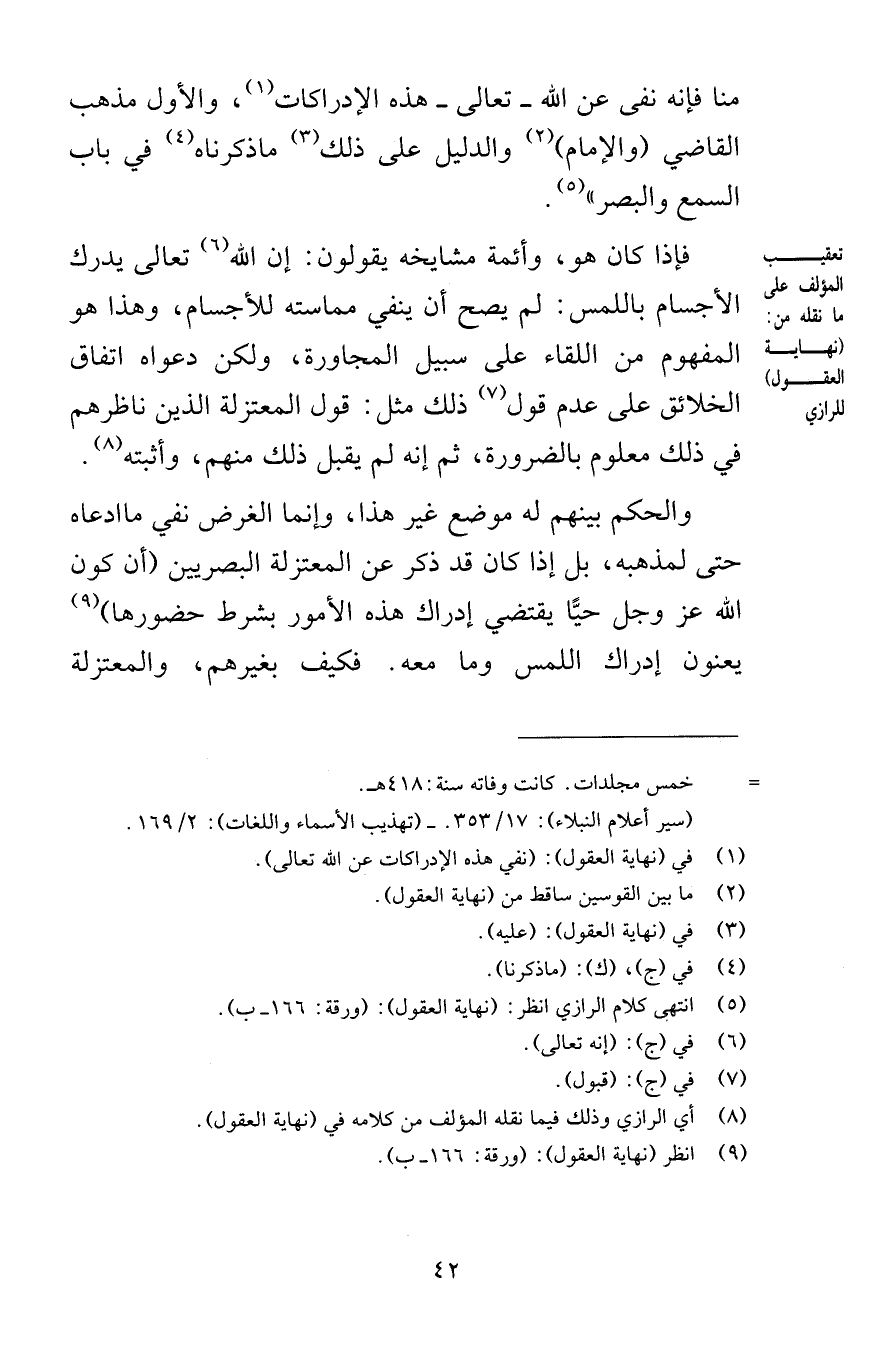 منا فإنه نفى عن الله تعالى هذه الإدراكات والأول مذهب القاضي والإمام والدليل على ذلك ما ذكرناه في باب السمع والبصر فإذا كان هو وأئمة مشايخه يقولون إن الله تعالى يدرك الأجسام باللمس لم يصح أن ينفي مماسته للأجسام وهذا هو المفهوم من اللقاء على سبيل المجاورة ولكن دعواه اتفاق الخلائق على عدم قول ذلك مثل قول المعتزلة الذين ناظرهم في ذلك معلوم بالضرورة ثم إنه لم يقبل ذلك منهم وأثبته والحكم بينهم له موضع غير هذا وإنما الغرض نفي ما ادعاه حتى لمذهبه بل إذا كان قد ذكر عن المعتزلة البصريين أن كون الله عز وجل حيًّا يقتضي إدراك هذه الأمور بشرط حضورها يعنون إدراك اللمس وما معه فكيف بغيرهم والمعتزلة
