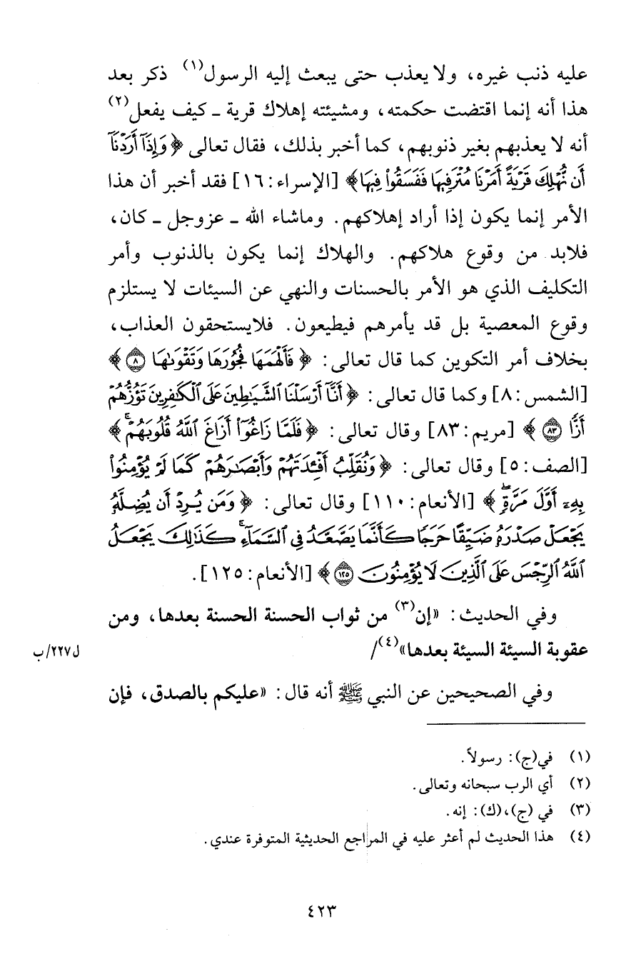 عليه ذنب غيره ولا يعذب حتى يبعث إليه الرسول ذكر بعد هذا انه إنما اقتضت حكمته ومشيئته إهلاك قرية كيف يفعل أنه لا يعذبهم بغير ذنوبهم كما أخبر بذلك فقال تعالى وَإِذَا أَرَدْنَا أَنْ نُهْلِكَ قَرْيَةً أَمَرْنَا مُتْرَفِيهَا فَفَسَقُوا فِيهَا [الإسراء 16] فقد أخبر أن هذا الأمر إنما يكون إذا أراد هلاكهم وما شاء الله عز وجل كان فلابد من وقوع هلاكهم والهلاك إنما يكون بالذنوب وأمر التكليف الذي هو الأمر بالحسنات والنهي عن السيئات لا يستلزم وقوع المعصية بل قد يأمرهم فيطيعون فلا يستحقون العذاب بخلاف أمر التكوين كما قال تعالى فَأَلْهَمَهَا فُجُورَهَا وَتَقْوَاهَا (8) [الشمس 8] وكما قال تعالى أَنَّا أَرْسَلْنَا الشَّيَاطِينَ عَلَى الْكَافِرِينَ تَؤُزُّهُمْ أَزًّا (83) [مريم 83] وقال تعالى فَلَمَّا زَاغُوا أَزَاغَ اللَّهُ قُلُوبَهُمْ [الصف 5] وقال تعالى وَنُقَلِّبُ أَفْئِدَتَهُمْ وَأَبْصَارَهُمْ كَمَا لَمْ يُؤْمِنُوا بِهِ أَوَّلَ مَرَّةٍ [الأنعام 110] وقال تعالى وَمَنْ يُرِدْ أَنْ يُضِلَّهُ يَجْعَلْ صَدْرَهُ ضَيِّقًا حَرَجًا كَأَنَّمَا يَصَّعَّدُ فِي السَّمَاءِ كَذَلِكَ يَجْعَلُ اللَّهُ الرِّجْسَ عَلَى الَّذِينَ لَا يُؤْمِنُونَ (125) [الأنعام 125] وفي الحديث إن من ثواب الحسنة الحسنة بعدها ومن عقوبة السيئة السيئة بعدها وفي الصحيحين عن النبي صلى الله عليه وسلم أنه قال عليكم بالصدق فإن