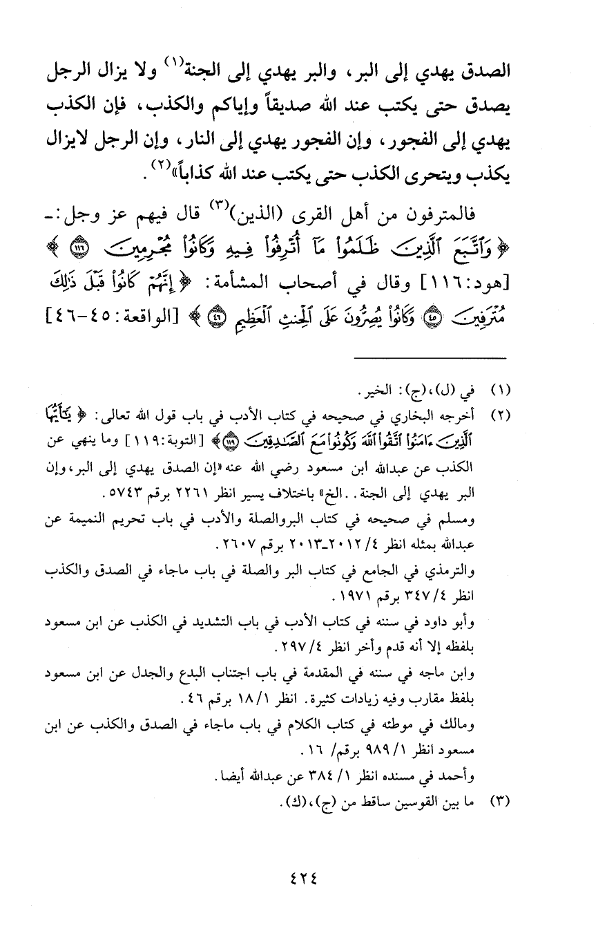 الصدق يهدي إلى البر والبر يهدي إلى الجنة ولا يزال الرجل يصدق حتى يكتب عند الله صديقاً وإياكم والكذب فإن الكذب يهدي إلى الفجور وإن الفجور يهدي إلى النار وإن الرجل لا يزال يكذب ويتحرى الكذب حتى يكتب عند الله كذاباً فالمترفون من أهل القرى الذين قال فيهم الله عز وجل وَاتَّبَعَ الَّذِينَ ظَلَمُوا مَا أُتْرِفُوا فِيهِ وَكَانُوا مُجْرِمِينَ (116) [هود 116] وقال في أصحاب المشأمة إِنَّهُمْ كَانُوا قَبْلَ ذَلِكَ مُتْرَفِينَ (45) وَكَانُوا يُصِرُّونَ عَلَى الْحِنْثِ الْعَظِيمِ (46) [الواقعة 45-46]