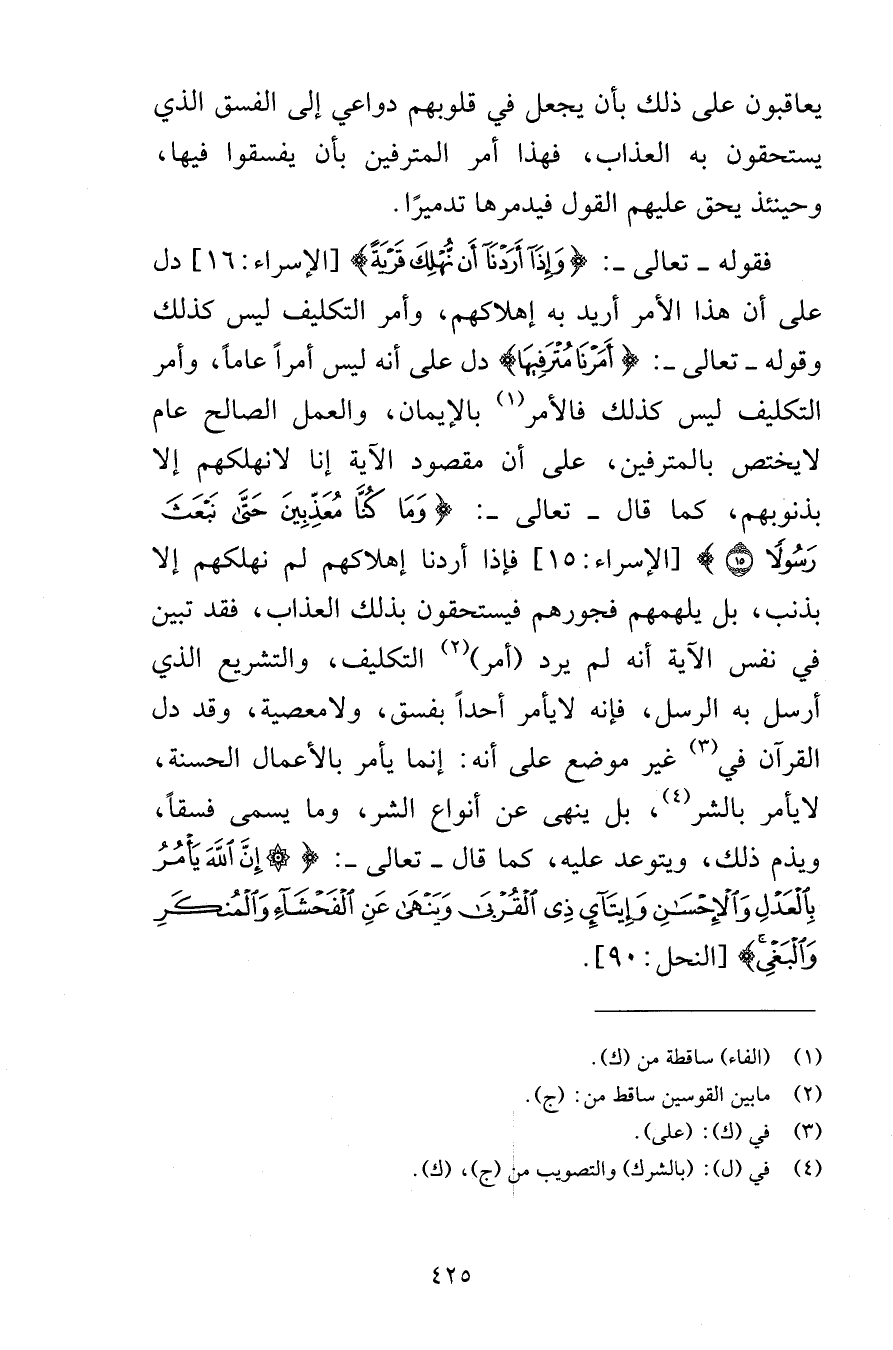 يعاقبون على ذلك بأن يجعل في قلوبهم دواعي إلى الفسق الذي يستحقون به العذاب فهذا أمر المترفين بأن يفسقوا فيها وحينئذ يحق عليهم القول فيدمرها تدميراً فقوله تعالى وَإِذَا أَرَدْنَا أَنْ نُهْلِكَ قَرْيَةً [الإسراء 16] دل على أن هذا الأمر أريد به إهلاكهم وأمر التكليف ليس كذلك وقوله تعالى أَمَرْنَا مُتْرَفِيهَا دل على أنه ليس أمراً عاماً وأمر التكليف ليس كذلك فالأمر بالإيمان والعمل الصالح عام لا يختص بالمترفين على أن مقصود الآية إنا لا نهلكهم إلا بذنوبهم كما قال تعالى وَمَا كُنَّا مُعَذِّبِينَ حَتَّى نَبْعَثَ رَسُولًا (15) [الإسراء 15] فإذا أردنا إهلاكهم لم نهلكهم إلا بذنب بل يلهمهم فجورهم فيستحقون بذلك العذاب فقد تبين في نفس الآية أنه لم يرد أمر التكليف والتشريع الذي أرسل به الرسل فإنه لا يأمر أحداً بفسق ولا معصية وقد دل القرآن في غير موضع على أنه إنما يأمر بالأعمال الحسنة لا يأمر بالشر بل ينهى عن أنواع الشر وما يسمى فسقاً ويذم ذلك ويتوعد عليه كما قال تعالى إِنَّ اللَّهَ يَأْمُرُ بِالْعَدْلِ وَالْإِحْسَانِ وَإِيتَاءِ ذِي الْقُرْبَى وَيَنْهَى عَنِ الْفَحْشَاءِ وَالْمُنْكَرِ وَالْبَغْيِ [النحل 90]