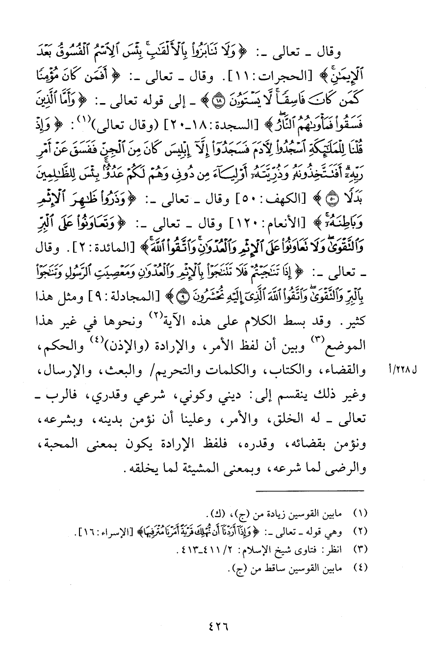 وقال تعالى وَلَا تَنَابَزُوا بِالْأَلْقَابِ بِئْسَ الِاسْمُ الْفُسُوقُ بَعْدَ الْإِيمَانِ [الحجرات 11] وقال تعالى أَفَمَنْ كَانَ مُؤْمِنًا كَمَنْ كَانَ فَاسِقًا لَا يَسْتَوُونَ (18) إلى قوله تعالى وَأَمَّا الَّذِينَ فَسَقُوا فَمَأْوَاهُمُ النَّارُ [السجدة 18-20] وقال تعالى وَإِذْ قُلْنَا لِلْمَلَائِكَةِ اسْجُدُوا لِآدَمَ فَسَجَدُوا إِلَّا إِبْلِيسَ كَانَ مِنَ الْجِنِّ فَفَسَقَ عَنْ أَمْرِ رَبِّهِ أَفَتَتَّخِذُونَهُ وَذُرِّيَّتَهُ أَوْلِيَاءَ مِنْ دُونِي وَهُمْ لَكُمْ عَدُوٌّ بِئْسَ لِلظَّالِمِينَ بَدَلًا (50) [الكهف 50] وقال تعالى وَذَرُوا ظَاهِرَ الْإِثْمِ وَبَاطِنَهُ [الأنعام 120] وقال تعالى وَتَعَاوَنُوا عَلَى الْبِرِّ وَالتَّقْوَى وَلَا تَعَاوَنُوا عَلَى الْإِثْمِ وَالْعُدْوَانِ وَاتَّقُوا اللَّهَ [المائدة 2] وقال تعالى إِذَا تَنَاجَيْتُمْ فَلَا تَتَنَاجَوْا بِالْإِثْمِ وَالْعُدْوَانِ وَمَعْصِيَتِ الرَّسُولِ وَتَنَاجَوْا بِالْبِرِّ وَالتَّقْوَى وَاتَّقُوا اللَّهَ الَّذِي إِلَيْهِ تُحْشَرُونَ (9) [المجادلة 9] ومثل هذا كثير وقد بسط الكلام على هذه الآية ونحوها في غير هذا الموضع وبين أن لفظ الأمر والإرادة والإذن والحكم والقضاء والكتاب والكلمات والتحريم والبعث والإرسال وغير ذلك ينقسم إلى ديني وكوني شرعي وقدري فالرب تعالى له الخلق والأمر وعلينا أن نؤمن بدينه وبشرعه ونؤمن بقضائه وقدره فلفظ الإرادة يكون بمعنى المحبة والرضى لما شرعه وبمعنى المشيئة لما يخلقه