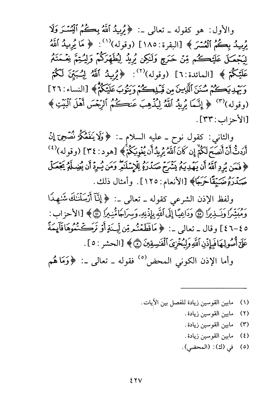 والأول هو كقوله تعالى يُرِيدُ اللَّهُ بِكُمُ الْيُسْرَ وَلَا يُرِيدُ بِكُمُ الْعُسْرَ [البقرة 185] وقوله مَا يُرِيدُ اللَّهُ لِيَجْعَلَ عَلَيْكُمْ مِنْ حَرَجٍ وَلَكِنْ يُرِيدُ لِيُطَهِّرَكُمْ وَلِيُتِمَّ نِعْمَتَهُ عَلَيْكُمْ [المائدة 6] وقوله يُرِيدُ اللَّهُ لِيُبَيِّنَ لَكُمْ وَيَهْدِيَكُمْ سُنَنَ الَّذِينَ مِنْ قَبْلِكُمْ وَيَتُوبَ عَلَيْكُمْ [النساء 26] وقوله إِنَّمَا يُرِيدُ اللَّهُ لِيُذْهِبَ عَنْكُمُ الرِّجْسَ أَهْلَ الْبَيْتِ [الأحزاب 33] والثاني كقول نوح عليه السلام وَلَا يَنْفَعُكُمْ نُصْحِي إِنْ أَرَدْتُ أَنْ أَنْصَحَ لَكُمْ إِنْ كَانَ اللَّهُ يُرِيدُ أَنْ يُغْوِيَكُمْ [هود 34] وقوله فَمَنْ يُرِدِ اللَّهُ أَنْ يَهْدِيَهُ يَشْرَحْ صَدْرَهُ لِلْإِسْلَامِ وَمَنْ يُرِدْ أَنْ يُضِلَّهُ يَجْعَلْ صَدْرَهُ ضَيِّقًا حَرَجًا [الأنعام 125] وأمثال ذلك ولفظ الإذن الشرعي كقوله تعالى إِنَّا أَرْسَلْنَاكَ شَاهِدًا وَمُبَشِّرًا وَنَذِيرًا (45) وَدَاعِيًا إِلَى اللَّهِ بِإِذْنِهِ وَسِرَاجًا مُنِيرًا (46) [الأحزاب 45-46] وقال تعالى مَا قَطَعْتُمْ مِنْ لِينَةٍ أَوْ تَرَكْتُمُوهَا قَائِمَةً عَلَى أُصُولِهَا فَبِإِذْنِ اللَّهِ وَلِيُخْزِيَ الْفَاسِقِينَ (5) [الحشر 5] وأما الإذن الكوني المحض فقوله تعالى وَمَا هُمْ
