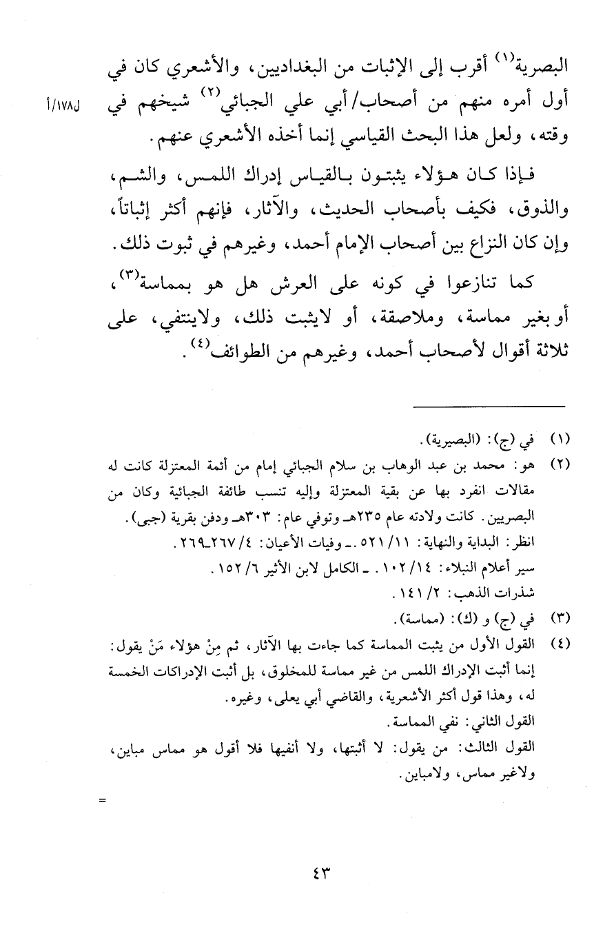 البصرية أقرب إلى الإثبات من البغداديين والأشعري كان في أول أمره منهم من أصحاب أبي علي الجبائي شيخهم في وقته ولعل هذا البحث القياسي إنما أخذه الأشعري عنهم فإذا كان هؤلاء يثبتون بالقياس إدراك اللمس والشم والذوق فكيف بأصحاب الحديث والآثار فإنهم أكثر إثباتاً وإن كان النزاع بين أصحاب الإمام أحمد وغيرهم في ثبوت ذلك كما تنازعوا في كونه على العرش هل هو بمماسة أو بغير مماسة وملاصقة أو لا يثبت ذلك ولا ينتفي على ثلاثة أقوال لأصحاب أحمد وغيرهم من الطوائف
