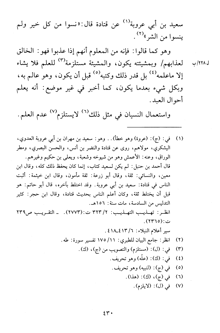 سعيد بن أبي عروبة عن قتادة قال نسوا من كل خير ولم ينسوا من الشر وهو كما قالوا فإنه من المعلوم أنهم إذا عذبوا فهو الخالق لعذابهم وبمشيئته يكون والمشيئة مستلزمة للعلم فلا يشاء إلا ما علمه بل قدر ذلك وكتبه قبل أن يكون وهو عالم به وبكل شيء بعدما يكون كما أخبر في غير موضع أنه يعلم أحوال العبد واستعمال النسيان في مثل ذلك لا يستلزم عدم العلم
