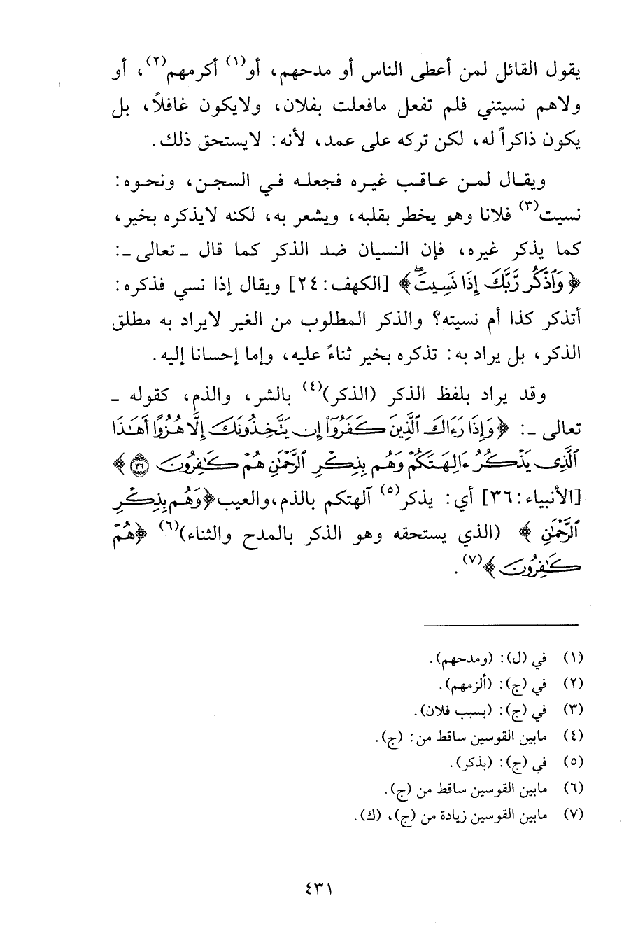 يقول القائل لمن أعطى الناس أو مدحهم أو أكرمهم أو ولاهم نسيتني فلم تفعل ما فعلت بفلان ولا يكون غافلاً بل يكون ذاكراً له لكن تركه على عمد لأنه لا يستحق ذلك ويقال لمن عاقب غيره فجعله في السجن ونحوه نسيت فلانا وهو يخطر بقلبه ويشعر به لكنه لا يذكره بخير كما يذكره غيره فإن النسيان ضد الذكر كما قال تعالى وَاذْكُرْ رَبَّكَ إِذَا نَسِيتَ [الكهف 24] ويقال إذا نسي ذكره أتذكر كذا أم نسيته والذكر المطلوب من الغير لا يراد به مطلق الذكر بل يراد به تذكره بخير ثناءً عليه وإما إحسانا إليه وقد يراد بلفظ الذكر الذكر بالشر والذم كقوله تعالى وَإِذَا رَآكَ الَّذِينَ كَفَرُوا إِنْ يَتَّخِذُونَكَ إِلَّا هُزُوًا أَهَذَا الَّذِي يَذْكُرُ آلِهَتَكُمْ وَهُمْ بِذِكْرِ الرَّحْمَنِ هُمْ كَافِرُونَ (36) [الأنبياء 36] أي يذكر آلهتكم بالذم والعيب وَهُمْ بِذِكْرِ الرَّحْمَنِ الذي يستحقه وهو الذكر بالمدح والثناء هُمْ كَافِرُونَ
