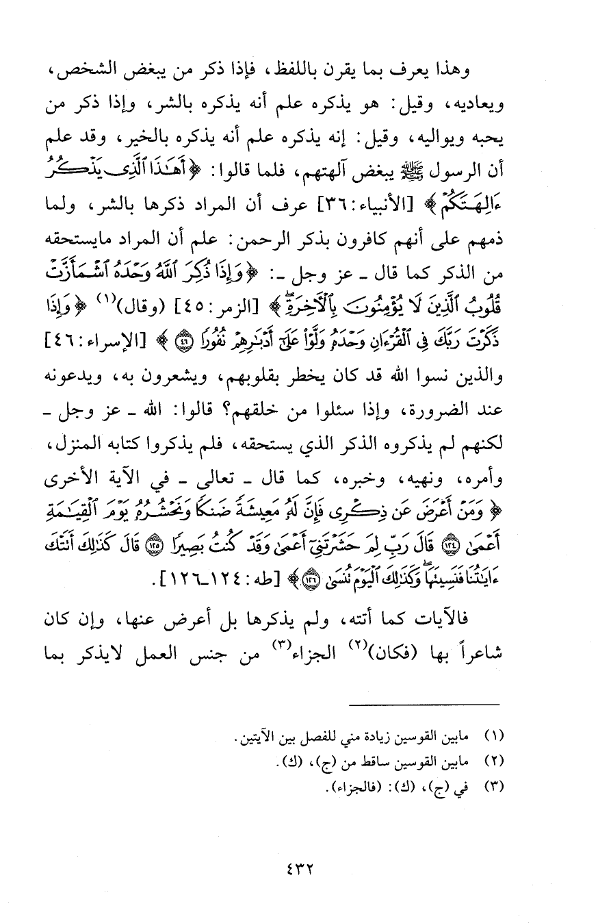 وهذا يعرف بما يقرن باللفظ فإذا ذكر من يبغض الشخص ويعاديه وقيل هو يذكره علم أنه يذكره بالشر وإذا ذكر من يحبه ويواليه وقيل إنه يذكره علم أنه يذكره بالخير وقد علم أن الرسول صلى الله عليه وسلم يبغض آلهتهم قلما قالوا أَهَذَا الَّذِي يَذْكُرُ آلِهَتَكُمْ [الأنبياء 36] عرف أن المراد ذكرها بالشر ولما ذمهم على أنهم كافرون بذكر الرحمن علم أن المراد ما يستحقه من الذكر كما قال عز وجل وَإِذَا ذُكِرَ اللَّهُ وَحْدَهُ اشْمَأَزَّتْ قُلُوبُ الَّذِينَ لَا يُؤْمِنُونَ بِالْآخِرَةِ [الزمر 45] وقال وَإِذَا ذَكَرْتَ رَبَّكَ فِي الْقُرْآنِ وَحْدَهُ وَلَّوْا عَلَى أَدْبَارِهِمْ نُفُورًا (46) [الإسراء 46] والذين نسوا الله قد كان يخطر بقلوبهم ويشعرون به ويدعونه عند الضرورة وإذا سئلوا من خلقهم قالوا الله عز وجل لكنهم لم يذكروه الذكر الذي يستحقه فلم يذكروا كتابه المنزل وأمره ونهيه وخبره كما قال تعالى في الآية الأخرى وَمَنْ أَعْرَضَ عَنْ ذِكْرِي فَإِنَّ لَهُ مَعِيشَةً ضَنْكًا وَنَحْشُرُهُ يَوْمَ الْقِيَامَةِ أَعْمَى (124) قَالَ رَبِّ لِمَ حَشَرْتَنِي أَعْمَى وَقَدْ كُنْتُ بَصِيرًا (125) قَالَ كَذَلِكَ أَتَتْكَ آيَاتُنَا فَنَسِيتَهَا وَكَذَلِكَ الْيَوْمَ تُنْسَى (126) [طه 124-126] فالآيات كما أتته ولم يذكرها بل أعرض عنها وإن كان شاعراً بها فكان الجزاء من جنس العمل لا يذكر بما