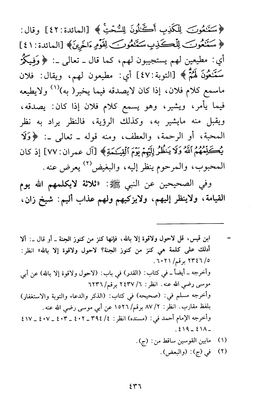 سَمَّاعُونَ لِلْكَذِبِ أَكَّالُونَ لِلسُّحْتِ [المائدة 42] وقال سَمَّاعُونَ لِلْكَذِبِ سَمَّاعُونَ لِقَوْمٍ آخَرِينَ [المائدة 41] أي مطيعين لهم يستجيبون لهم كما قال تعالى وَفِيكُمْ سَمَّاعُونَ لَهُمْ [التوبة 47] أي مطيعون لهم ويقال فلان ما سمع كلام فلان إذا كان لا يصدقه فيما يخبر به ولا يطيعه فيما يأمر ويشير وهو يسمع كلام فلان إذا كان يصدقه ويقبل منه ما يشير به وكذلك الرؤية فالنظر يراد به نظر المحبة أو الرحمة والعطف ومنه قوله تعالى وَلَا يُكَلِّمُهُمُ اللَّهُ وَلَا يَنْظُرُ إِلَيْهِمْ يَوْمَ الْقِيَامَةِ [آل عمران 77] إذ كان المحبوب والمرحوم ينظر إليه والبغيض يعرض عنه وفي الصحيحين عن النبي صلى الله عليه وسلم ثلاثة لا يكلمهم الله يوم القيامة ولا ينظر إليهم ولا يزكيهم ولهم عذاب أليم شيخ زان