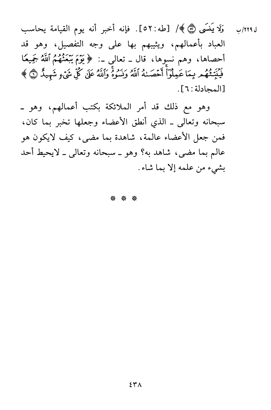 وَلَا يَنْسَى (52) [طه 52] فإنه أخبر أنه يوم القيامة يحاسب العباد بأعمالهم ويثيبهم بها على وجه التفصيل وهو قد أحصاها وهم نسوها قال تعالى يَوْمَ يَبْعَثُهُمُ اللَّهُ جَمِيعًا فَيُنَبِّئُهُمْ بِمَا عَمِلُوا أَحْصَاهُ اللَّهُ وَنَسُوهُ وَاللَّهُ عَلَى كُلِّ شَيْءٍ شَهِيدٌ (6) [المجادلة 6] وهو مع ذلك قد أمر الملائكة بكتب أعمالهم وهو سبحانه وتعالى الذي أنطق الأعضاء وجعلها تخبر بما كان فمن جعل الأعضاء عالمة شاهدة بما مضى كيف لا يكون هو عالم بما مضى شاهد به وهو سبحانه وتعالى لا يحيط أحد بشيء من علمه إلا بما شاء