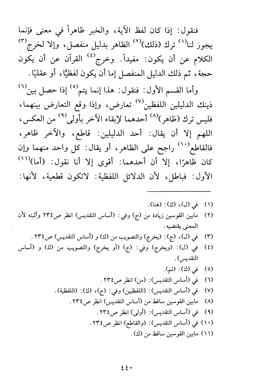 فنقول إذا كان لفظ الآية والخبر ظاهراً في معنى فإنما يجوز لنا ترك ذلك الظاهر بدليل منفصل وإلا لخرج الكلام عن أن يكون مفيداً وخرج القرآن عن أن يكون حجة ثم ذلك الدليل المنفصل إما أن يكون لفظيًّا أو عقليّا وأما القسم الأول فنقول هذا إنما يتم إذا حصل بين ذينك الدليلين اللفظين تعارض وإذا وقع التعارض بينهما فليس ترك ظاهر أحدهما لإبقاء الآخر بأولى من العكس اللهم إلا أن يقال أحد الدليلين قاطع والآخر ظاهر فالقاطع راجح على الظاهر أو يقال كل واحد منهما وإن كان ظاهراً إلا أن أحدهما أقوى إلا أنا نقول أما الأول فباطل لأن الدلائل اللفظية لا تكون قطعية لأنها