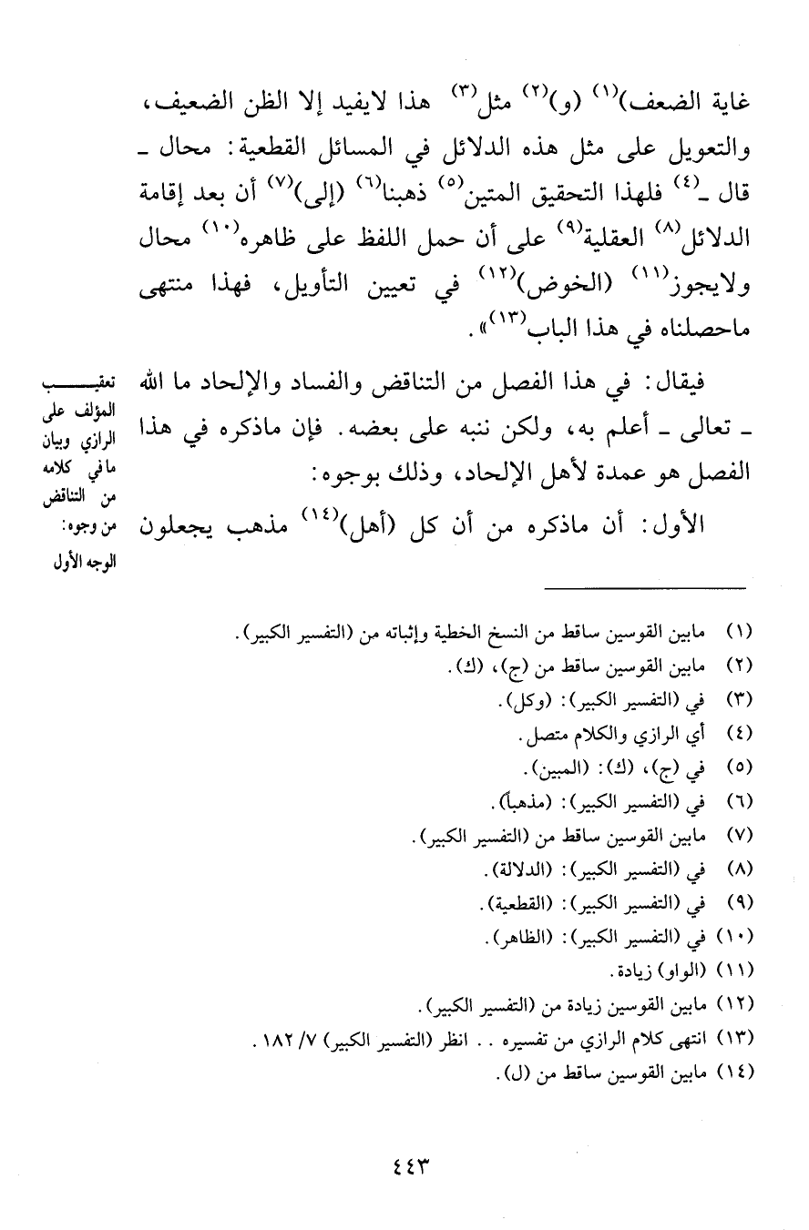 غاية الضعف ومثل هذا لا يفيد إلا الظن الضعيف والتعويل على مثل هذه الدلائل في المسائل القطعية محال قال فلهذا التحقيق المتين ذهبنا إلى أن بعد إقامة الدلائل العقلية على أن حمل اللفظ على ظاهره محال ولا يجوز الخوض في تعيين التأويل فهذا منتهى ما حصلناه في هذا الباب فيقال في هذا الفصل من التناقض والفساد والإلحاد ما الله تعالى أعلم به ولكن ننبه على بعضه فإن ما ذكره في هذا الفصل هو عمدة لأهل الإلحاد وذلك بوجوه الأول أن ما ذكره من أن كل أهل مذهب يجعلون