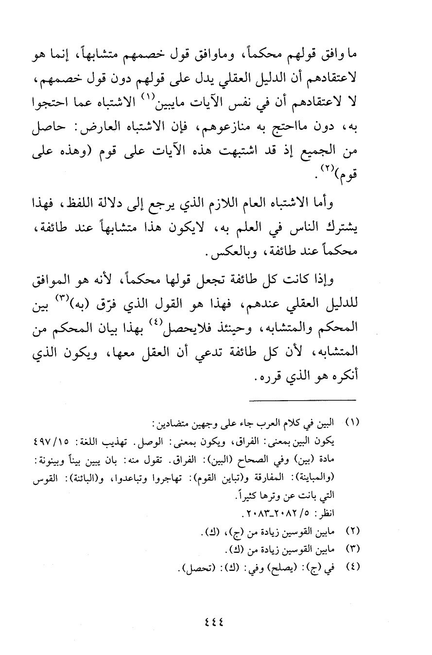 ما وافق قولهم محكماً وما وافق قول خصمهم متشابهاً إنما هو لاعتقادهم أن الدليل العقلي يدل على قولهم دون قول خصمهم لا لاعتقادهم أن في نفس الآيات ما يبين الاشتباه عما احتجوا به دون ما احتج به منازعوهم فإن الاشتباه العارض حاصل من الجميع إذ قد اشتبهت هذه الآيات على قوم وهذه على قوم وأما الاشتباه العام اللازم الذي يرجع إلى دلالة اللفظ فهذا يشترك الناس في العلم به لا يكون هذا متشابهاً عند طائفة محكماً عند طائفة وبالعكس وإذا كانت كل طائفة تجعل قولها محكماً لأنه هو الموافق للدليل العقلي عندهم فهذا هو القول الذي فرّق به بين المحكم والمتشابه لأن كل طائفة تدعي أن العقل معها ويكون الذي أنكره هو الذي قرره