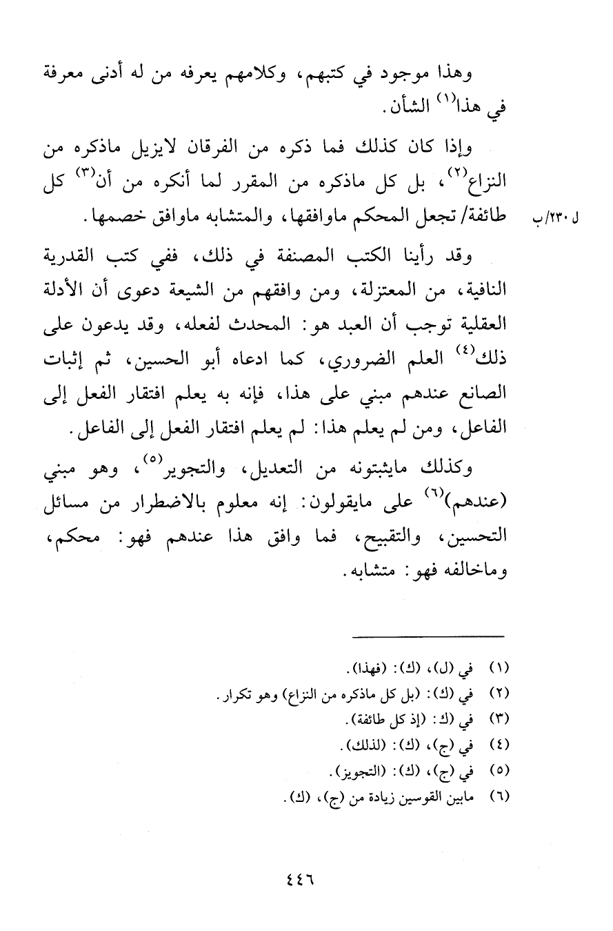 وهذا موجود في كتبهم وكلامهم ويعرفه من له أدنى معرفة في هذا الشأن وإذا كان كذلك فما ذكره من الفرقان لا يزيل ما ذكره من النزاع بل ما ذكره من المقرر بما أنكره من أن كل طائفة تجعل المحكم ما وافقها والمتشابه ما وافق خصمها وقد رأينا الكتب المصنفة في ذلك ففي كتب القدرية النافية من المعتزلة ومن وافقهم من الشيعة دعوى أن الأدلة العقلية توجب أن العبد هو المحدث لفعله وقد يدعون على ذلك العلم الضروري كما ادعاه أبو الحسين ثم إثبات الصانع عندهم مبني على هذا فإنه به يعلم افتقار الفعل إلى الفاعل ومن لم يعلم هذا لم يعلم افتقار الفعل إلى الفاعل وكذلك ما يثبتونه من التعديل والتجوير وهو مبني عندهم على ما يقولون إنه معلوم بالاضطرار من مسائل التحسين والتقبيح فما وافق هذا عندهم فهو محكم وما خالفه فهو متشابه